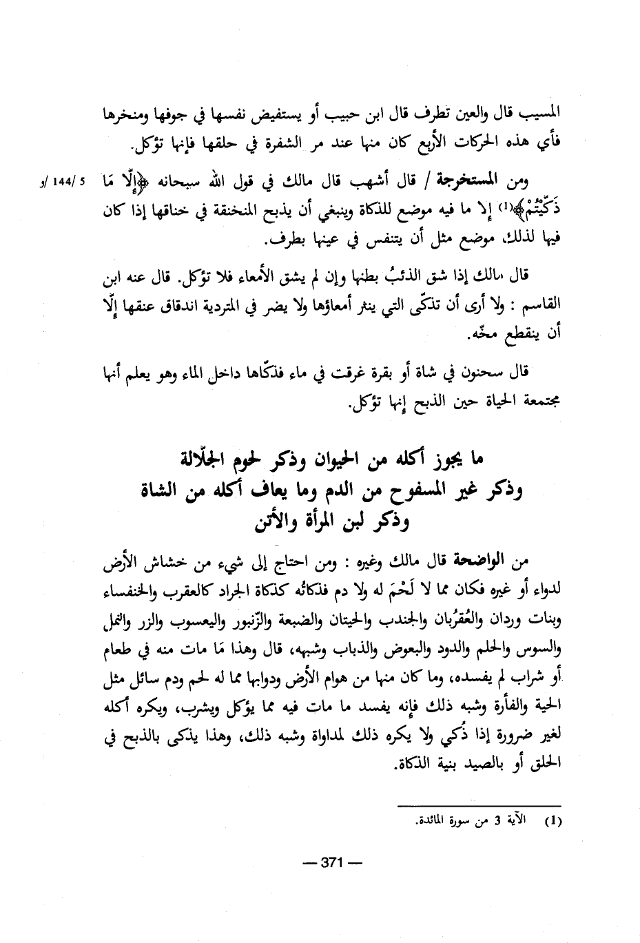 المسيب قال والعين تطرف قال ابن حبيب أو يستفيض نفسها في جوفها ومنخرها فأي هذه الحركات الأربع كان منها عند مر الشفرة في حلقها فإنها تؤكل.