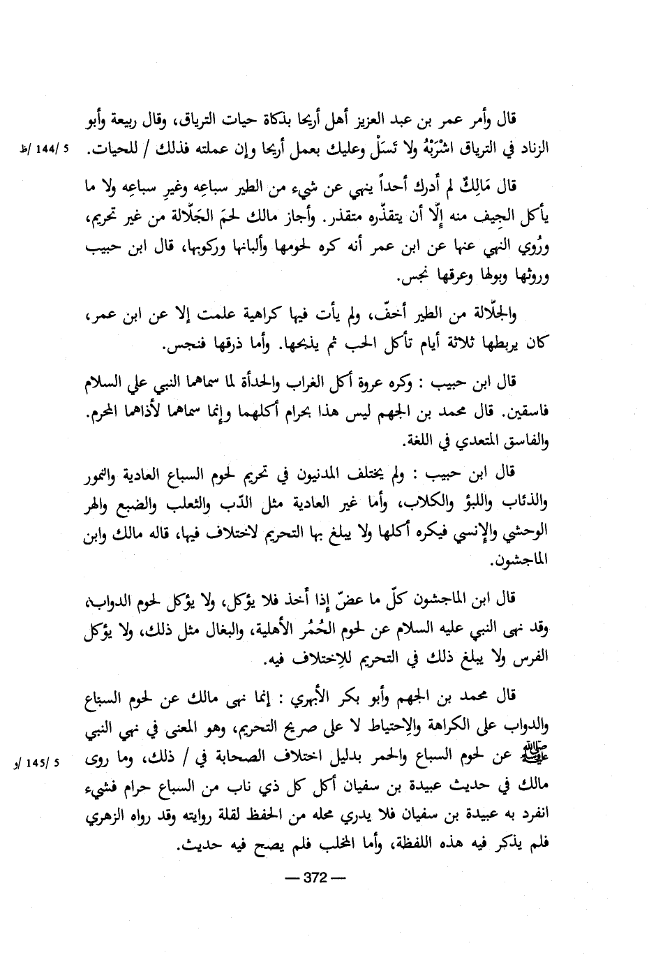 قال ابن حبيب: وكره عروة أكل الغراب والحدأة لما سماهما النبي علي السلام فاسقين. قال محمد بن الجهم ليس هذا بحرام أكلهما وإنما سماهما لأذاهما المحرم. والفاسق المتعدي في اللغة. قال ابن حبيب: ولم يختلف المدنيون في تحريم لحوم السباع العادية والنمور والذئاب واللبؤ والكلاب، وأما غير العادية مثل الدب والثعلب والضبع والهر الوحشي والإنسي فيكره أكلها ولا يبلغ بها التحريم لاختلاف فيها، قاله مالك وابن الماجشون.