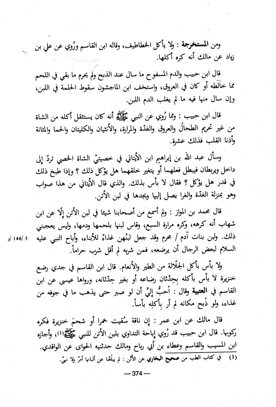 قال ابن حبيب والدم المسفوح ما سال عند الذبح ولم يحرم ما بقي في اللحم مما خالطه أو كان في العروق، واستخف ابن الماجشون سقوط الحلمة في اللبن، وإن سال منها فيه ما لم يغلب الدم اللبن.