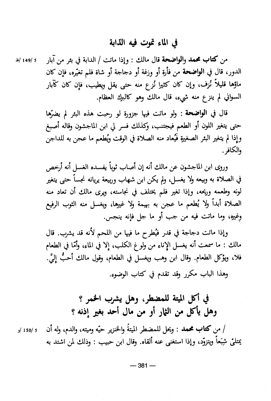 من كتاب محمد والواضحة قال مالك: وإذا ماتت الدابة في بئر من آبار الدور، قال في الواضحة من فأرة أو وزغة أو دجاجة أو شاة فلم تغيره، فإن كان ماؤها قليلاً نزف، وإن كان كثيراً نزع منه حتى يقل ويطيب، فإن كان كآبار السواني لم ينزع منه شيء، قال مالك وهو كالبرك العظام.