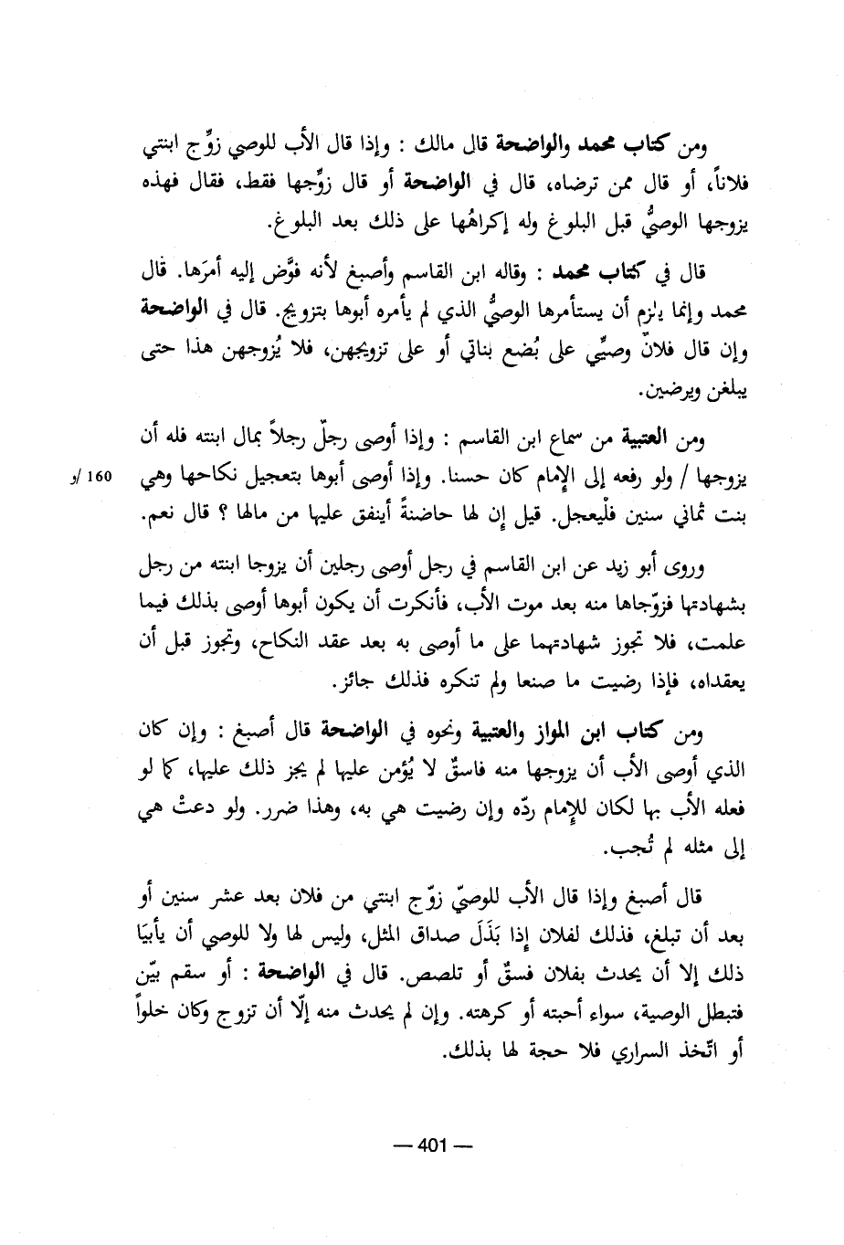 ومن كتاب محمد والواضحة قال مالك: وإذا قال الأب للوصي زوج ابنتي فلاناً، أو قال ممن ترضاه، قال في الواضحة أو قال زوجها فقط، فقال فهذه يزوجها الوصي قبل البلوغ وله إكراهها على ذلك بعد البلوغ.