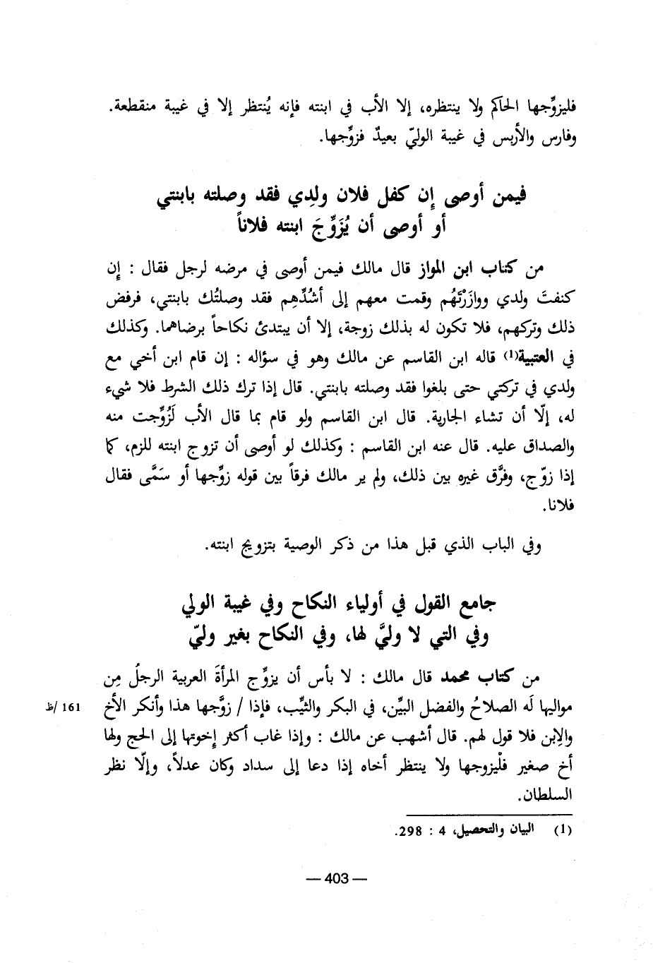 من كتاب ابن المواز قال مالك فيمن أوصى في مرضه لرجل فقال: إن كنفت ولدي ووازرتهم وقمت معهم إلى أشدهم فقد وصلتك بابنتي، فرفض ذلك وتركهم، فلا تكون له بذلك زوجة، إلا أن يبتدئ نكاحاً برضاهما. وكذلك في العتبية قاله ابن القاسم عن مالك وهو في سؤاله: إن قام ابن أخي مع ولدي في تركتي حتى بلغوا فقد وصلته بابنتي. قال إذا ترك هذا الشرط فلا شيء له، إلا أن تشاء الجارية. قال ابن القاسم ولو قام بما قال الأب لزوجت منه والصداق عليه. قال عنه ابن القاسم: وكذلك لو أوصى أن تزوج ابنته للزم، كما إذا زوج، وفرق غيره بين ذلك، ولم ير مالك فرقاً بين قوله زوجها أو سمى فقال فلاناً.