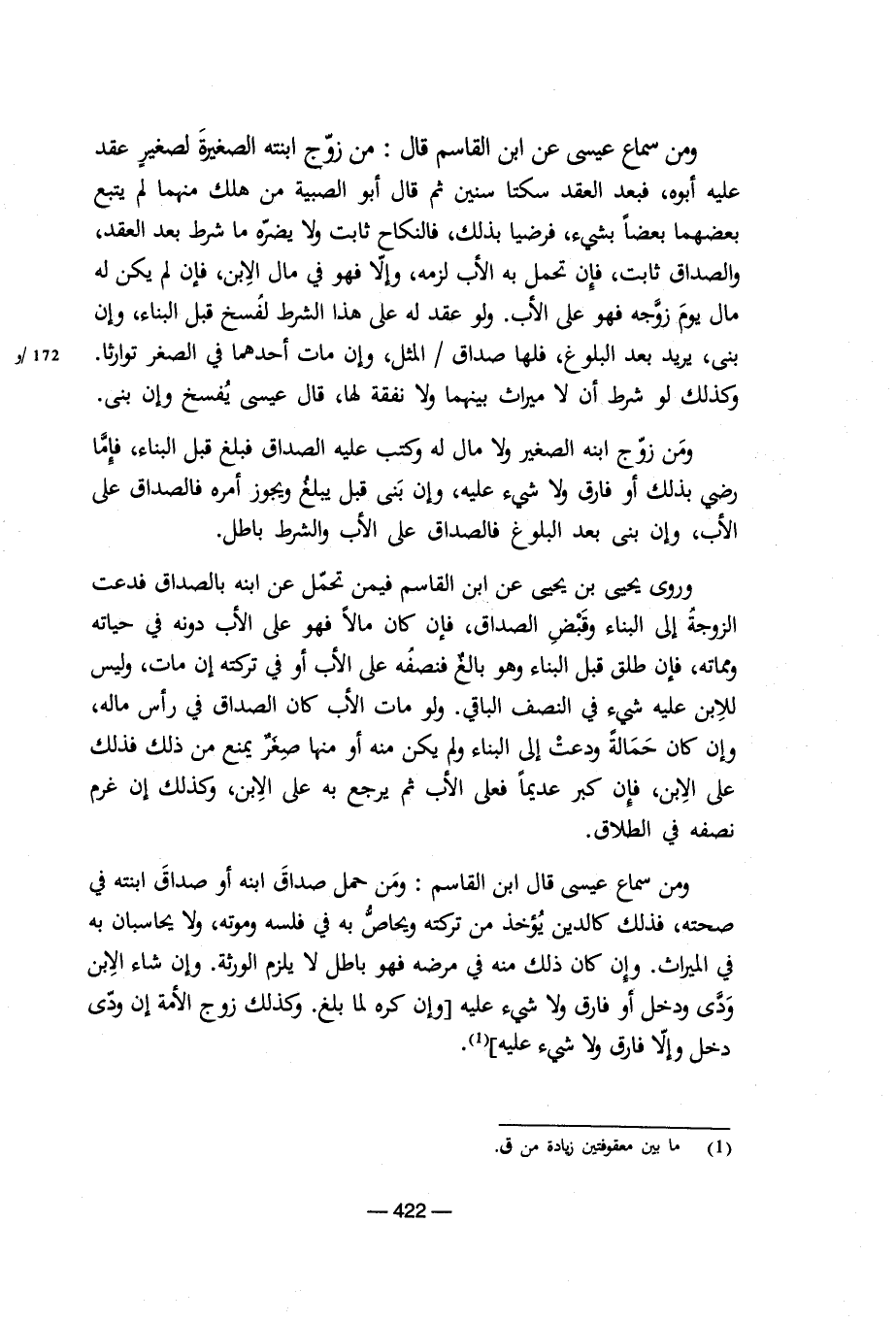 ومن سماع عيسى عن ابن القاسم قال: من زوج ابنته الصغيرة لصغير عقد عليه أبوه، فبعد العقد سكتا سنين ثم قال أبو الصبية من هلك منهما لم يتبع بعضهما بعضاً بشيء، فرضيا بذلك، فالنكاح ثابت ولا يضره ما شرط بعد العقد، والصداق ثابت، فإن تحمل به الأب لزمه، وإلا فهو في مال الابن، فإن لم يكن له مال يوم زوجه فهو على الأب. ولو عقد له على هذا الشرط لفسخ قبل البناء، وإن بنى، يريد بعد البلوغ، فلها صداق المثل، وإن مات أحدهما في الصغر توارثا وكذلك لو شرط أن لا ميراث بينهما ولا نفقة لها، قال عيسى يفسخ ولو بنى.