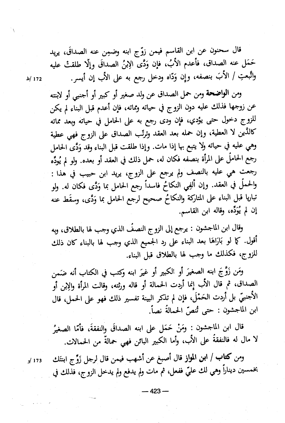 ومن الواضحة ومن حمل الصداق عن ولد صغير أو كبير أو أجنبي أو لابنته عن زوجها فذلك عليه دون الزوج في حياته ومماته، فإن أعدم قبل البناء لم يكن للزوج دخول حتى يؤدي، فإن ودى رجع به على الحامل في حياته وبعد مماته كالدين لا العطية، وإن حمله بعد العقد وترتب الصداق على الزوج فهي عطية وهي عليه في حياته ولا يتبع بها إذا مات وإذا طلقت قبل البناء وقد ودى الحامل رجع الحامل على المرأة بنصفه فكان له، حمل ذلك في العقد أو بعده. ولو لم يوده رجعت هي عليه بالنصف ولم يرجع على الزوج، يريد ابن حبيب في هذا: والحمل في العقد. وإن ألفي النكاح فاسداً رجع الحامل بما ودى فكان له. ولو تباريا قبل البناء على المتاركة والنكاح صحيح لرجع الحامل بما ودى، وسقط عنه إن لم يوده، وقاله ابن القاسم.