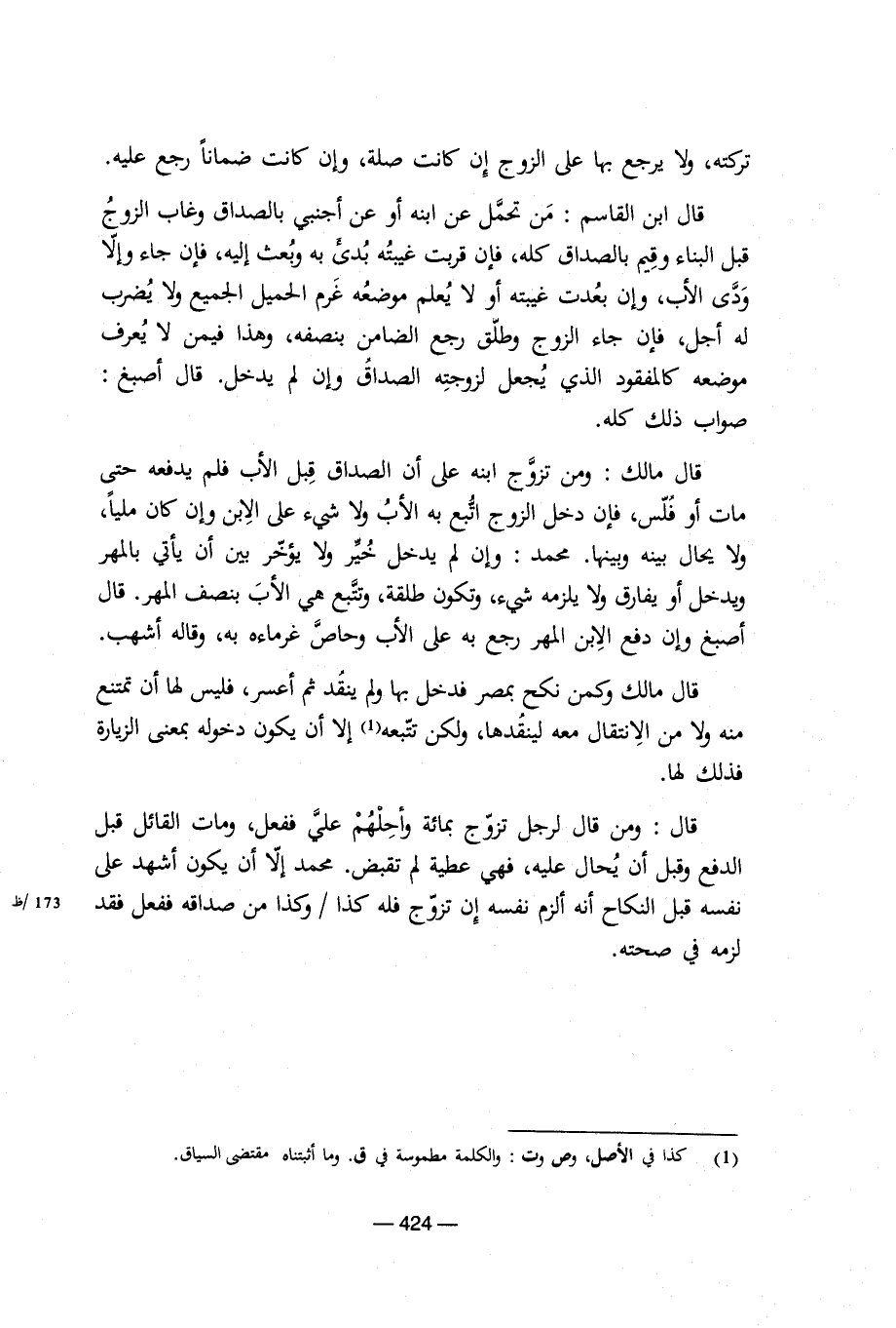 قال مالك: ومن تزوج ابنه على أن الصداق قبل الأب فلم يدفعه حتى مات أو فلس، فإن دخل الزوج اتبع به الأب ولا شيء على الابن وإن كان ملياً، ولا يحال بينه وبينها. محمد: وإن لم يدخل خير ولا يؤخر بين أن يأتي بالمهر ويدخل أو يفارق ولا يلزمه شيء، وتكون طلقة، وتتبع هي الأب بنصف المهر. قال أصبغ وإن دفع الابن المهر رجع به على الأب وحاص غراماءه به، وقاله أشهب. قال مالك وكمن نكح بمصر فدخل بها ولم ينقد ثم أعسر، فليس لها أن تمتنع منه ولا من الانتقال معه لينقدها، ولكن تتبعه إلا أن يكون دخوله بمعنى الزيارة فذلك لها.