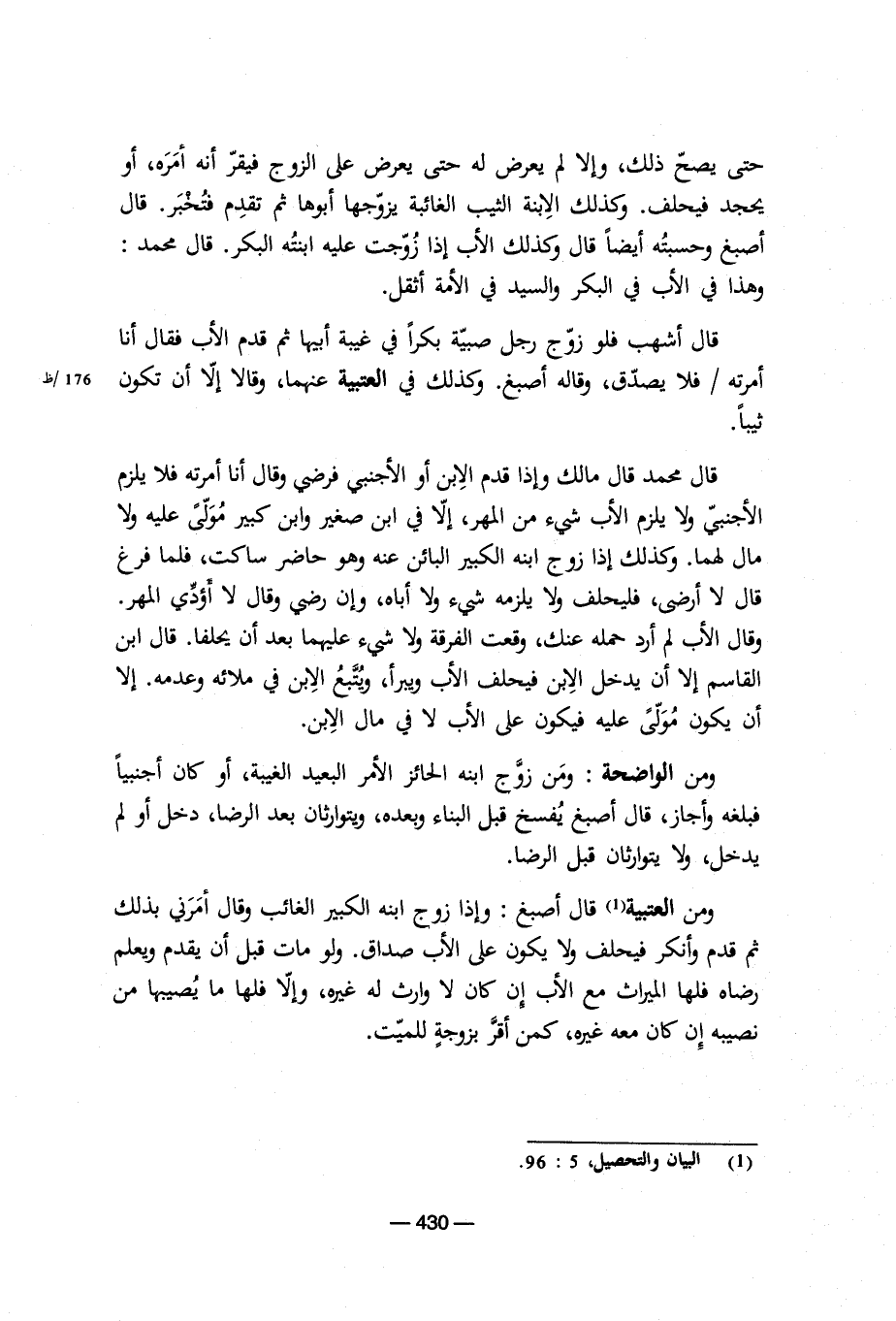 ومن الواضحة: ومن زوج ابنه الحائز الأمر البعيد الغيبة، أو كان أجنبيا فبلغه وأجاز، قال أصبغ يفسخ قبل البناء وبعده، ويتوارثان بعد الرضا، دخل أو لم يدخل، ولا يتوارثان قبل الرضا.