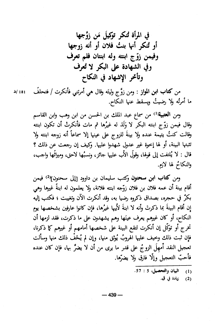 ومن العتبية من سماع عبد الملك بن الحسن من ابن وهب وابن القاسم وقال فيمن زوج ابنته البكر لا ولد له غيرها ثم مات فأنكرت أن تكون ابنته وقالت كنت يتيمة عنده ولا بينة للزوج علي عينها إلا سماعا أنه زوج ابنته ولا تثبتها البينة، أو لها إخوة غير عدول شهدوا عليها وكيف إن رجعت عن ذلك؟ قال: لا يلتفت إلى قولها، وقول الأب عليها جائز، ونسبها لاحق، وميراثها واجب، والنكاح لها لازم.