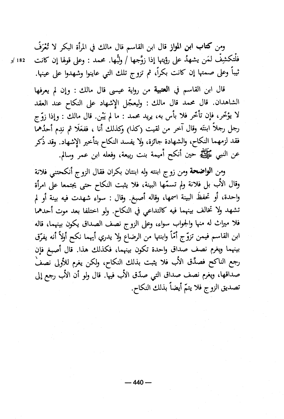 ومن كتاب ابن المواز قال ابن القاسم قال مالك في المرأة البكر لا تعرف فلتكشف لمن يشهد على رؤيتها إذا زوجها وليها. محمد: وعلى قولها إن كانت ثيبا وعلى صمتها إن كانت بكرا، ثم تزوج تلك التي عاينوا وشهدوا على عينها.