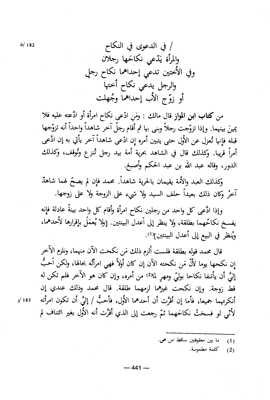 قال محمد قوله بطلقة فلست ألزم من نكحت الآن منهما، ونلزم الآخر إن نكاحها يوما لأن من نكحته الآن إن كان أولا فهي امرأته بحالها، ولكن أحب إلي أن يأتنفا نكاحا بولي ومهر لما من أمره، وإن كان هو الآخر فلم تكن له قط زوجة. وإن نكحت غيرهما لزماهما طلقة. قال محمد وذلك عندي إن أنكرتهما جميعا، فأما إن أقرت أن أحدهما الأول، فأحب إلي أن تكون امرأته لأني لو فسخت نكاحهما ثم رجعت إلى الذي أقرت أنه الأول بغير ائتناف لم