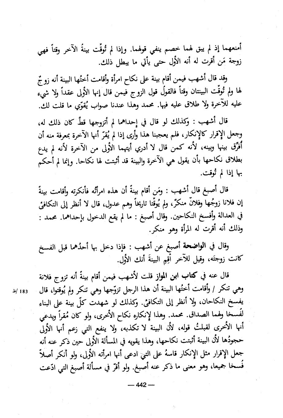 قال عنه في كتاب ابن المواز قلت لأشهب فيمن أقام بينة أنه تزوج فلانة وهي تنكر وأقامت أختها البينة أن هذا الرجل تزوجها وهي تنكر ولم يوقتوا، قال يفسخ النكاحان، ولا أنظر إلى التكافئ. وكذلك لو شهدت كل بينة على البناء لفسخا ولهما الصداق. محمد. وهذا لإنكاره نكاح الآخرة، ولو كان مقرا ويدعي أنها الآخرة لقبلت قوله، لأن البينة لا تكذبه، ولا ينفع التي زعم أنها الأولى حجودها لأن البينة أثبتت نكاحها، وهذا يقويه في المسألة الأولى حين ذكر عنه أنه جعل الإقرار مثل الإنكار قاسه على التي ادعى أنها امرأته الأولى، ولو أنكر أصلا فسخ جميعا، وهو معنى ما ذكر عنه أصبغ. ولو أقر في مسألة أصبغ التي ادعت