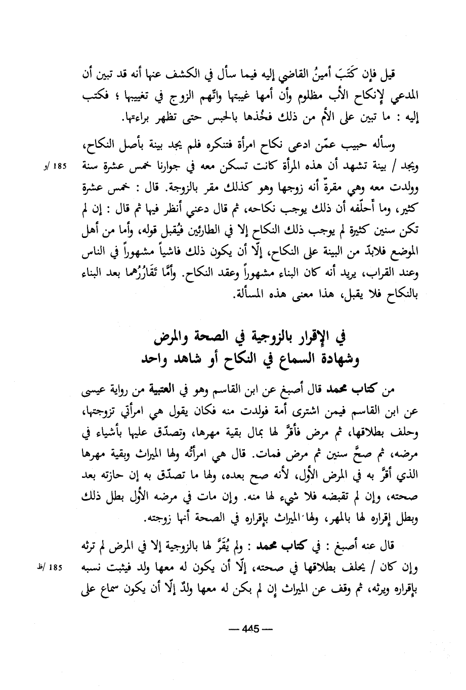 قال عنه أصبغ: في كتاب محمد: ولم يقر لها بالزوجية إلا في المرض لم ترثه وإن كان يحلف بطلاقها في صحته، إلا أن يكون له معها ولد فيثبت نسبه بإقراره ويرثه، ثم وقف عن الميراث إن لم يكن له معها ولد إلا أن يكون سماع على