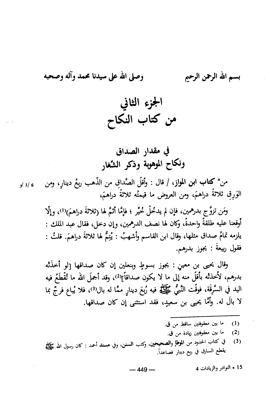 من كتاب ابن المواز قال: وأقل الصداق من الذهب ربع دينار، ومن الورق ثلاثة دراهم، ومن العروض ما قيمته ثلاثة دراهم،