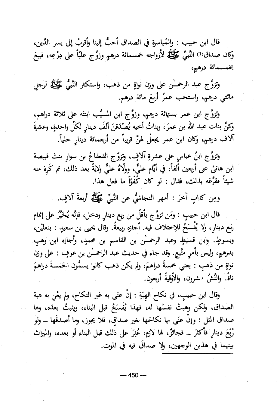 وتزوج عبد الرحمن على وزن نواة من ذهب، واستكثر النبي صلى الله علية وسلم لرجل مائتي درهم، واستحب عمر أربع مائة درهم.