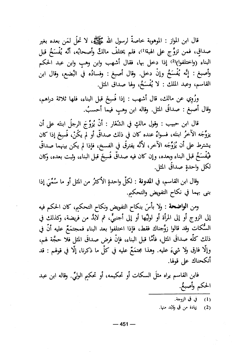 ومن الواضحة: ولا بأس بنكاح التفويض ونكاح التحكيم، كان الحكم فيه إلى الزوج أو إلى المرأة أو وليها أو إلى أجنبي، ثم لابد من فريضة، وكذلك في السكات وقد قالوا زوجناك فقط، فإذا اختلفوا بعد البناء فمجتمع عليه أن في ذلك كله صداق المثل، فأما قبل البناء، فإن فرض صداق المثل فلا حجة لهم، وإلا فارق ولا شيء عليه. وهذا مجتمع عليه في كل ما ذكرنا، إلا في قولهم: قد أنكحناك على قولها.