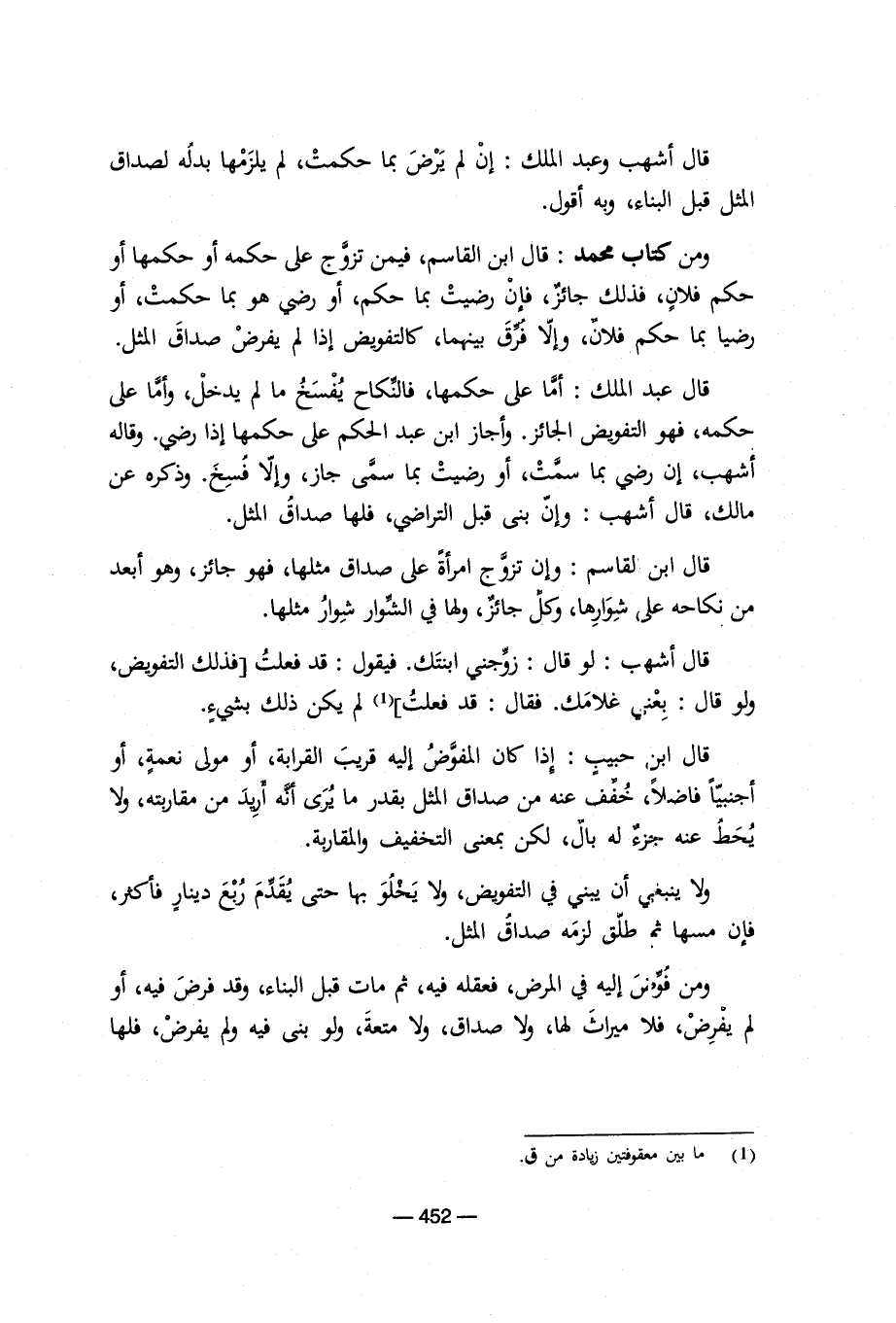 قال عبد الملك: أما على حكمها، فالنكاح يفسخ ما لم يدخل، وأما على حكمه، فهو التفويض الجائز. وأجاز ابن عبد الحكم على حكمها إذا رضي. وقاله أشهب، إن رضي بما سمت، أو رضيت بما سمى جاز، وإلا فسخ. وذكر عن مالك، قال أشهب: وإن بنى قبل التراضي، فلها صداق المثل.