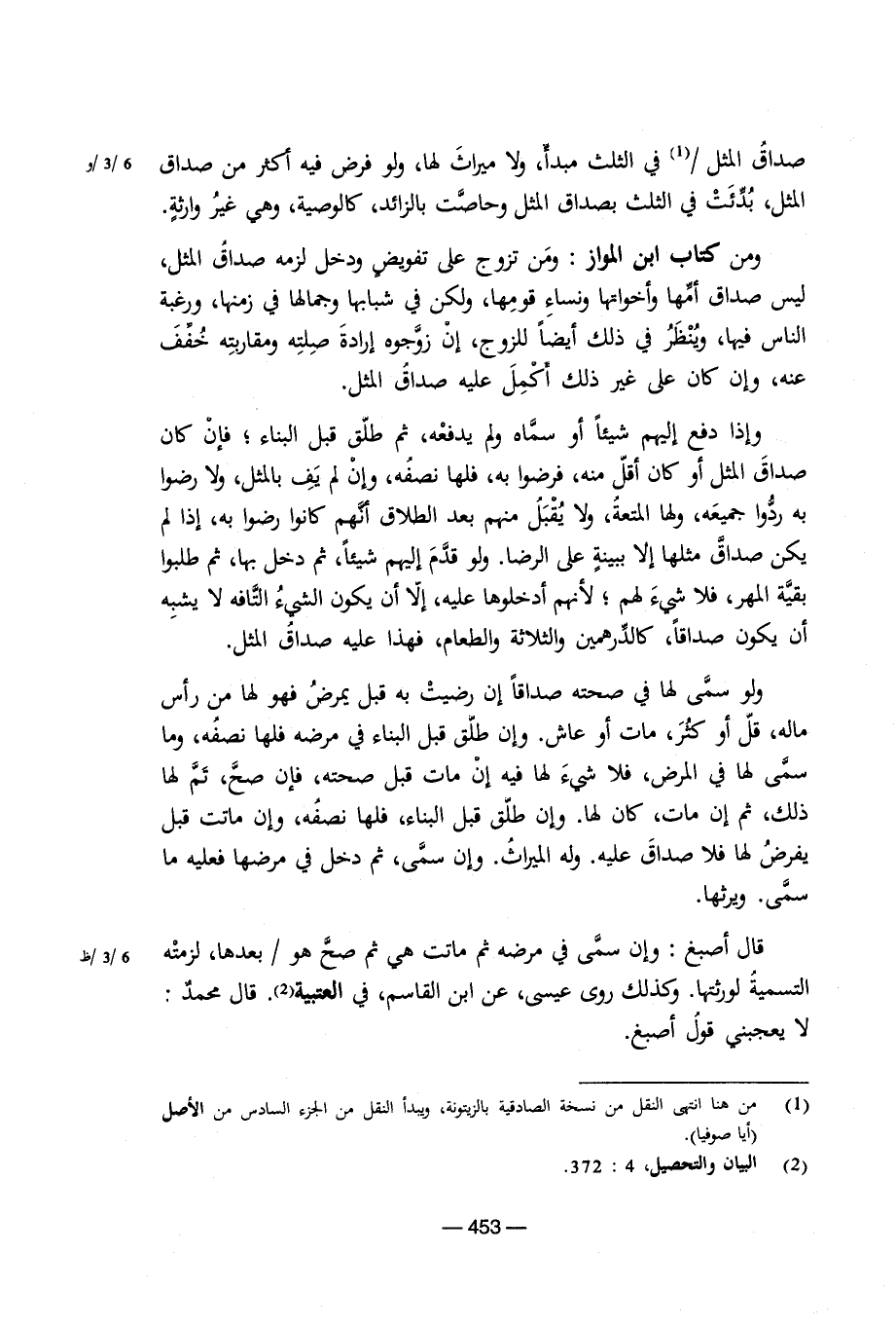ومن كتاب ابن المواز: ومن تزوج على تفويض ودخل لزمه صداق المثل، ليس صداق أمها وأخواتها ونساء قومها، ولكن في شبابها وجمالها في زمنها، ورغبة الناس فيها، وينظر في ذلك أيضاً للزوج، إن زوجوه إرادة صلته ومقاربته خفف عنه، وإن كان على غير ذلك أكمل عليه صداق المثل.