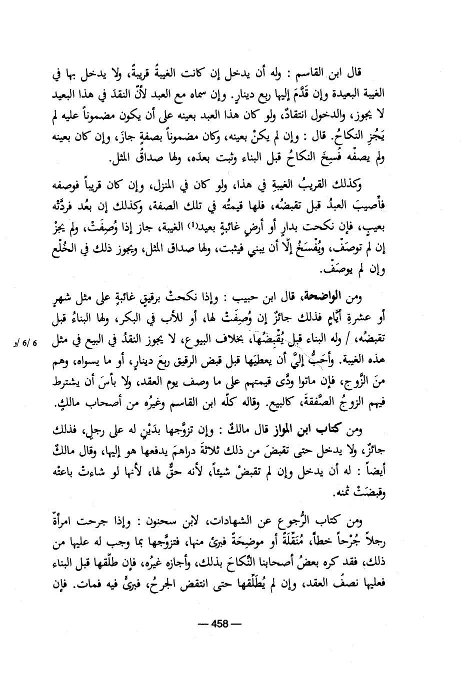 ومن الواضحة، قال ابن حبيب: وإذا نكحت برقيق غائبة على مثل شهر أو عشرة أيام فذلك جائز إن وصفت لها، أو للأب في البكر، ولها البناء قبل تقبضه، وله البناء قبل يقبضها، بخلاف البيوع، لا يجوز النقد في البيع في مثل هذه الغيبة وأحب إلي أن يعطيها قبل قبض الرقيق ربع دينار، أو ما يسواه، وهم من الزوج، فإن ماتوا ودى قيمتهم على ما وصف يوم العقد، ولا بأس أن يشترط فيهم الزوج الصفقة، كالبيع. وقاله كله ابن القاسم وغيره من أصحاب مالك.