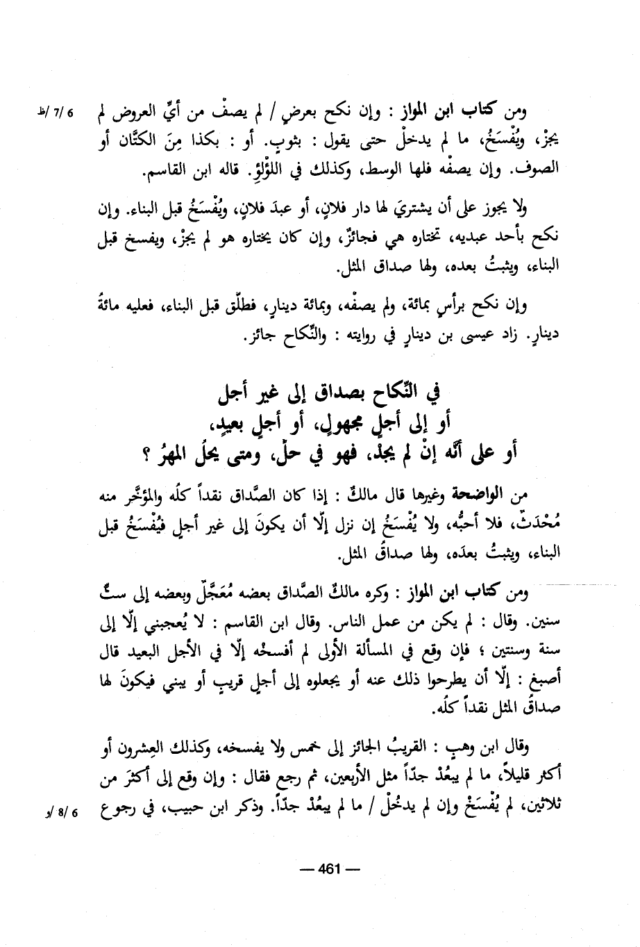 من الواضحة وغيرها قال مالك: إذا كان الصداق نقداً كله والمؤخر منه محدث، فلا أحبه، ولا يفسخ إن نزل إلا أن يكون إلى غير أجل فيفسخ قبل البناء، ويثبت بعده، ولها صداق المثل.