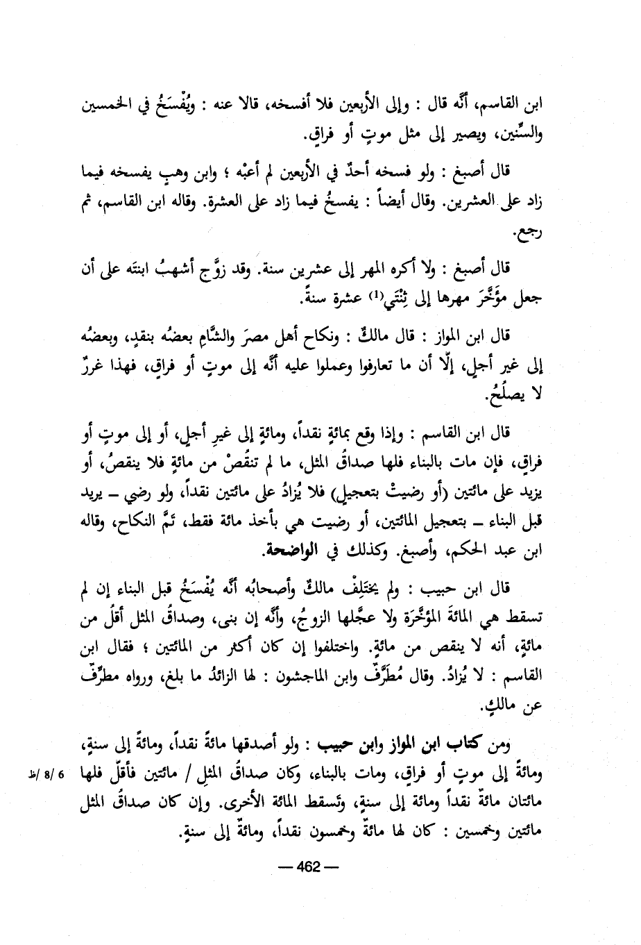 قال ابن المواز: قال مالك: ونكاح أهل مصر والشام بعضه بنقد، وبعضه إلى غير أجل، إلا أن ما تعارفوا وعملوا عليه أنه إلى موت أو فراق، فهذا غرر لا يصلح.