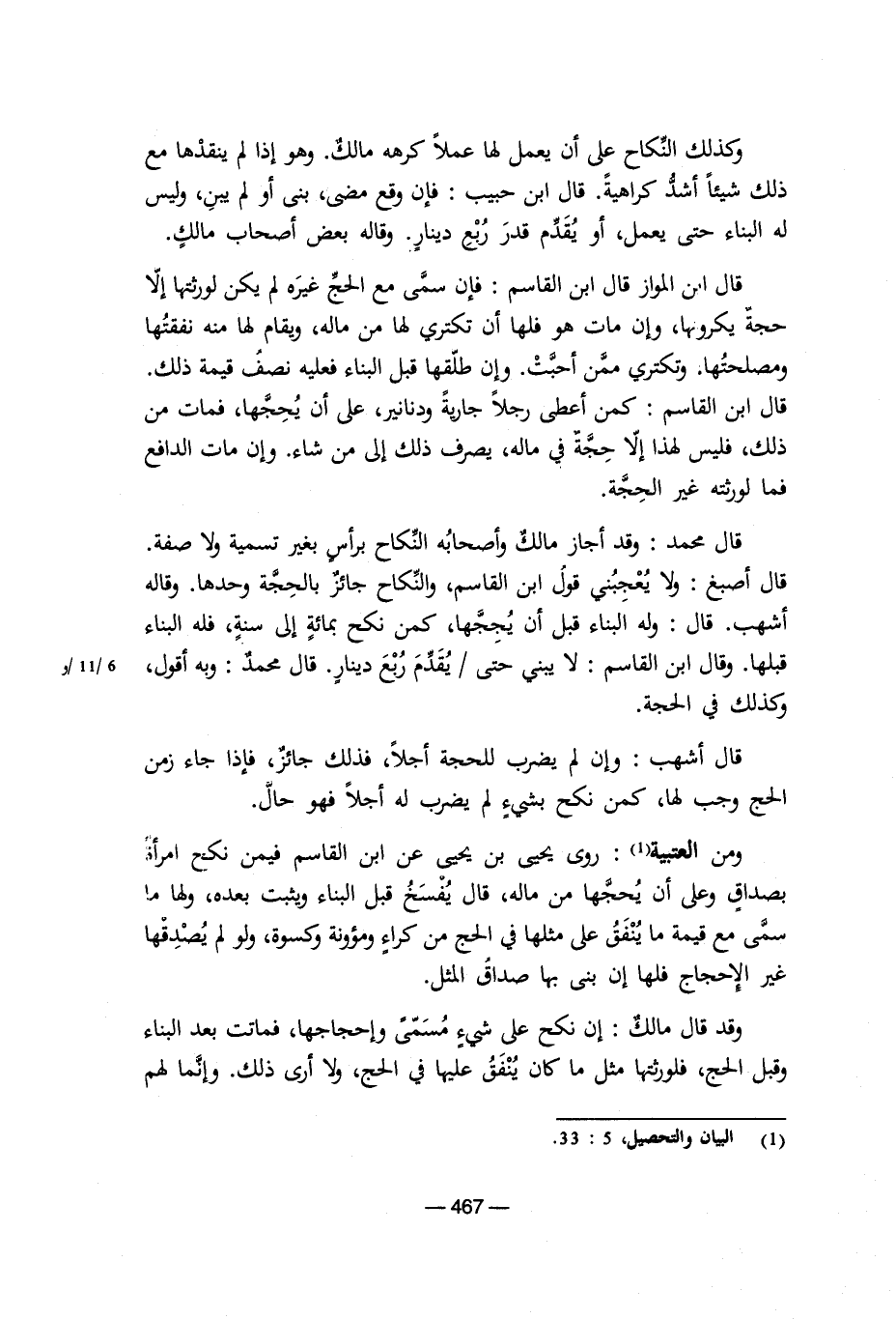 قال أصبغ: ولا يعجبني قول ابن القاسم، والنكاح جائز بالحجة وحدها. وقاله أشهب. قال: وله البناء قبل أن يججها، كمن نكح بمائة إلى سنة، فله البناء قبلها. وقال ابن القاسم: لا يبنى حتى يقدم ربع دينار. قال محمد: وبه أقول، وكذلك في الحجة.