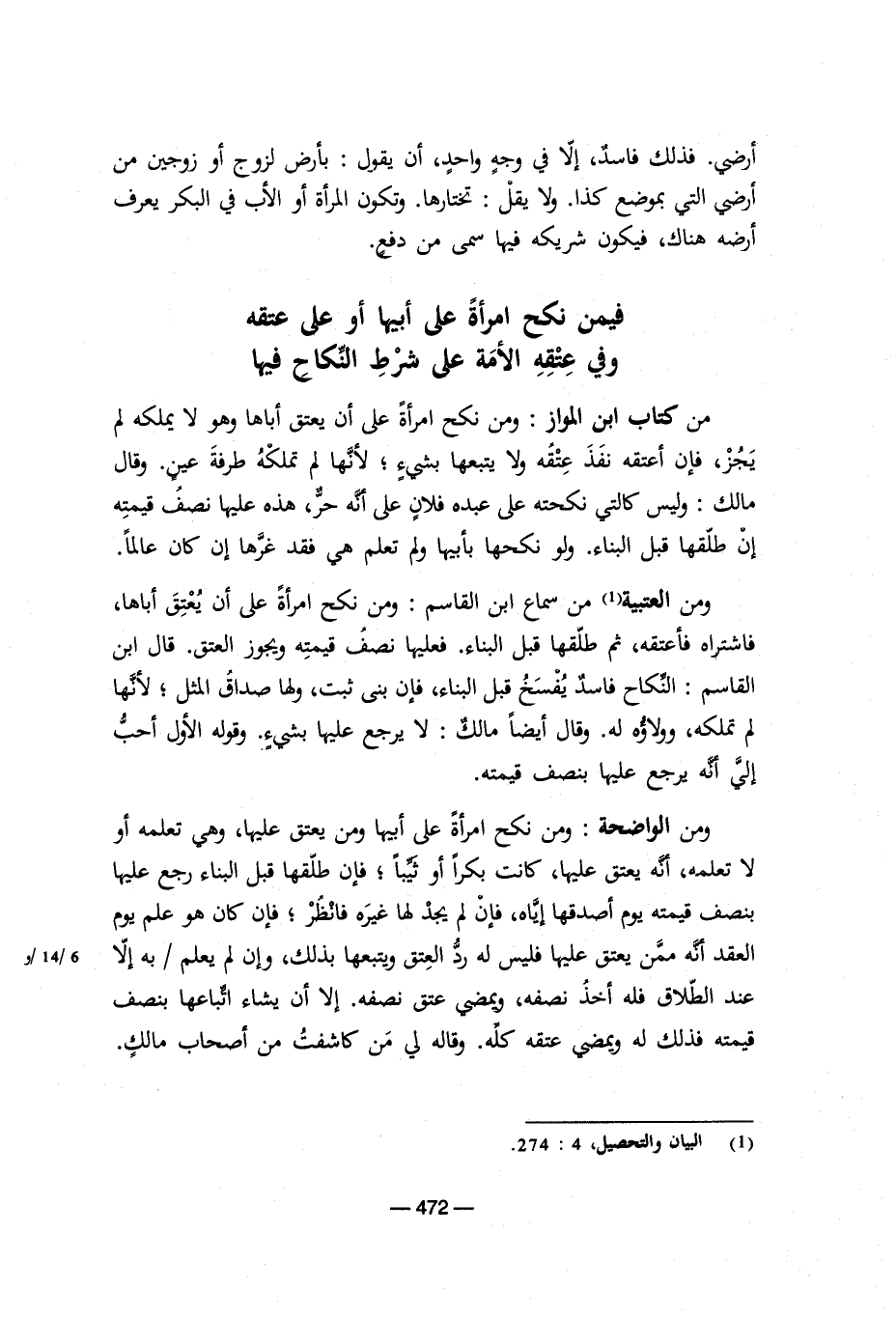 ومن العتبية من سماع ابن القاسم: ومن نكح امرأة على أن يعتق أباها, فاشتراه فأعتقه, ثم طلقها قبل البناء. فعليها نصف قيمته ويجوز العتق. قال ابن القاسم: النكاح فاسد يفسخ قبل البناء, فإن بنى ثبت, ولها صداق المثل؛ لأنها لم تملكه، وولاؤه له. وقال أيضاً مالك: لا يرجع عليها بشيء. وقوله الأول أحب إلي أنه يرجع عليها بنصف قيمته.