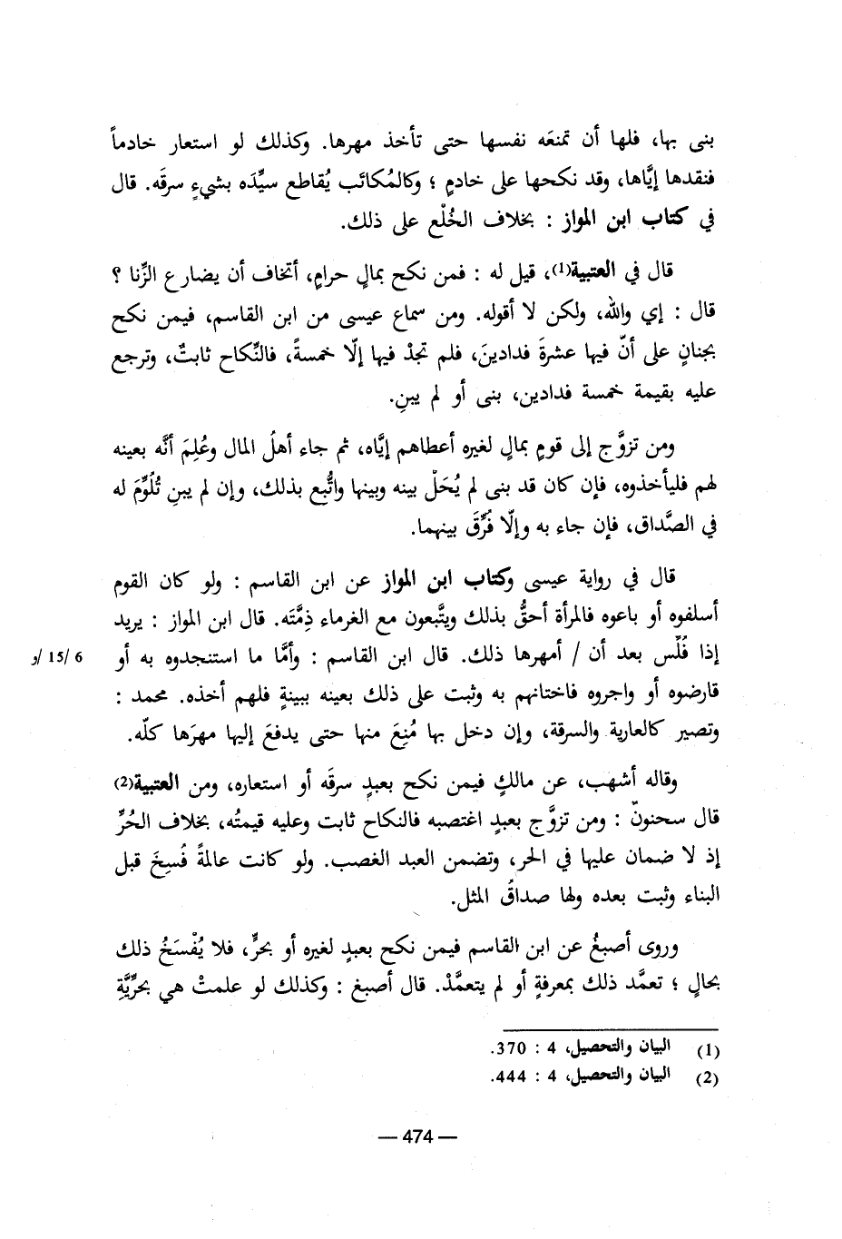 قال في العتبية, قيل له: فمن نكح بمال حرام, أتخاف أن يضارع الزِّنا؟ قال: إي والله, ولكن لا أقوله. ومن سماع عيسى من ابن القاسم, فيمن نكح بجنان على أن فيها عشرة فدادين, فلم تجد فيها إلا خمسة, فالنكاح ثابت, وترجع عليه بقيمة خمسة فدادين, بنى أو لم يبن.