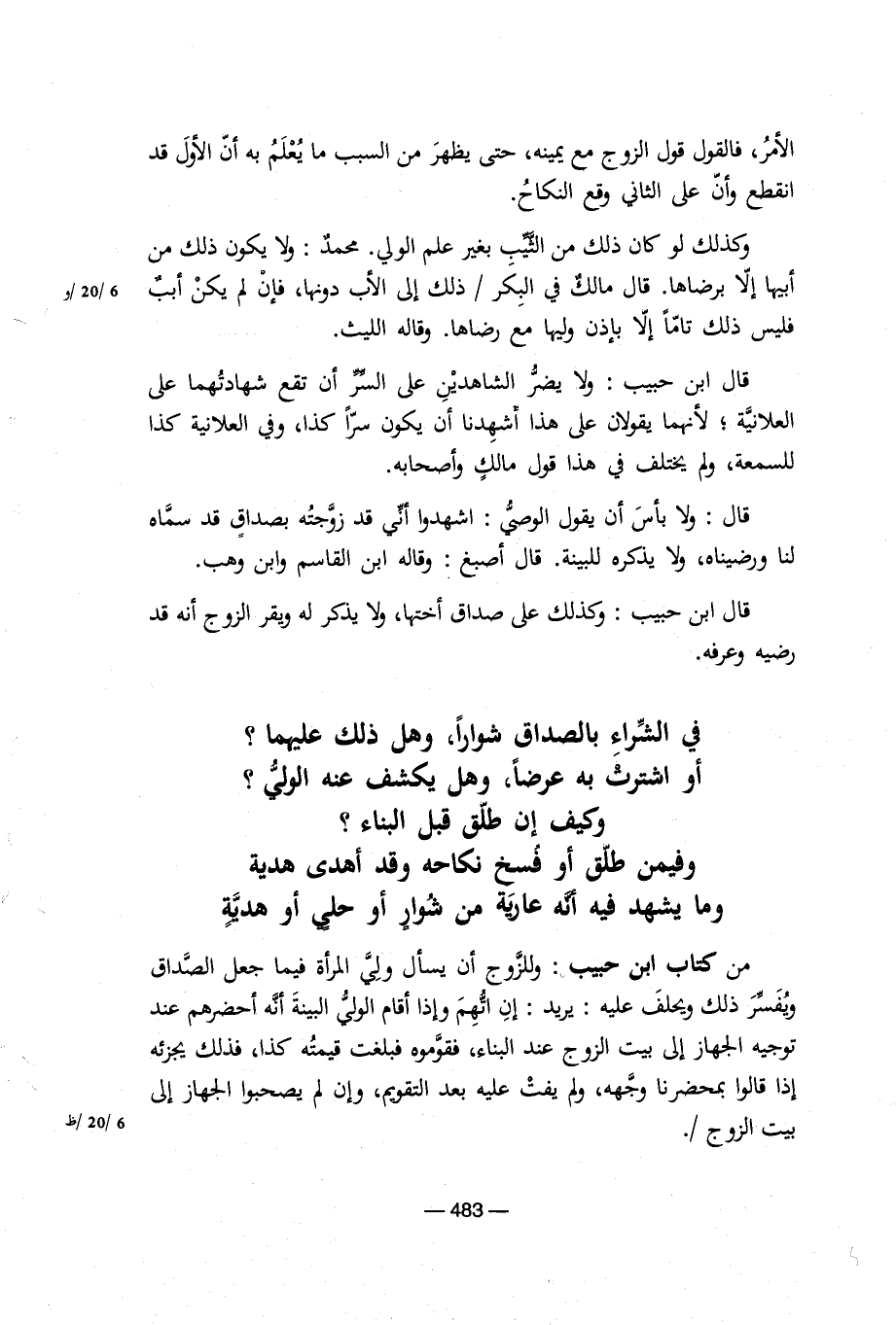 من كتاب ابن حبيب: وللزوج أن يسأل ولى المرأة فيما جعل الصداق ويفسر ذلك ويحلف عليه: يريد: إن اتهم وإذا أقام الولى البينة أنه أحضرهم عند توجيه الجهاز إلى بيت الزوج عند البناء، فقوموه فبلغت قيمته كذا، فذلك يجزئه إذا قالوا بمحضرنا وجهه، ولم يفت عليه بعد التقويم، وإن لم يصحبوا الجهاز إلى بيت الزوج.