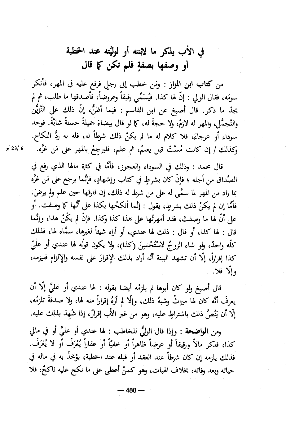 قال اصبغ ولو كان أبوها لم يلزمه أيضا بقوله: لها عندى أو على إلا أن يعرف انه كان لها ميراث وشبه ذلك، وإلا لم أره إقراراً منه لها، ولا صدقة تلزمه، إلا ان ينص ذلك باشتراط عليه، وهو من غير الأب إقراراً، إذا شهد بذلك عليه. ومن الواضحة: وإذا قال الولى للخاطب: لها عندى أو على أو فى مالى كذا، فذكر مالاً ورقيقاً أو عرضاً ظاهراً أو خفياً أو عقاراً يعرف او لا يعرف. فذلك يلزمه إن كان شرطاً عند العقد او قبله عند الخطبة، يؤخذ به فى ماله فى حياته وبعد وفاته، بخلاف الهبات، وهو كمن أعطى على ما نكح عليه ناكح، فلا