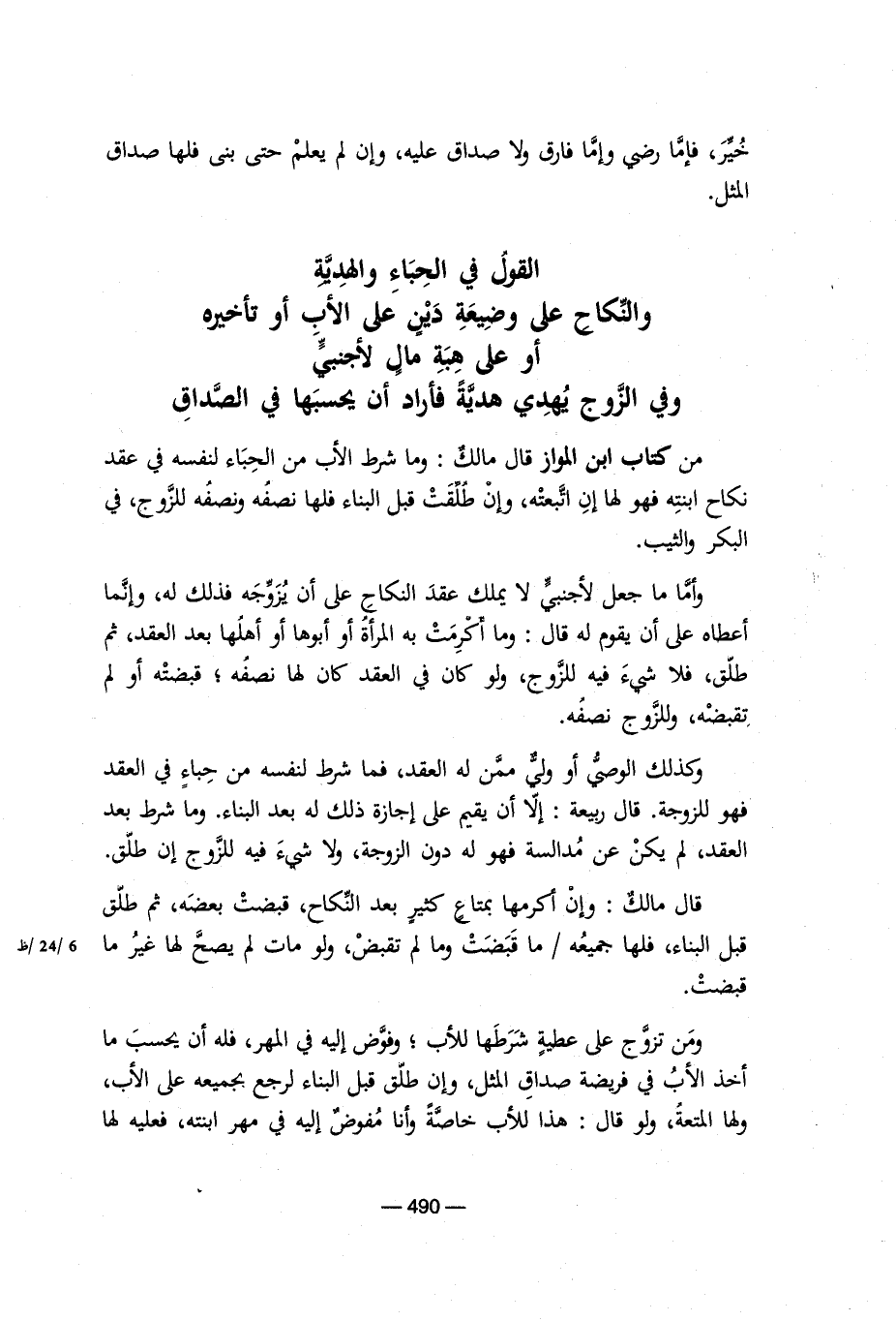 من كتاب ابن المواز قال مالك: وما شرط الب فى الحباء لنفسه فى عقد نكاح ابنته فهو لها إن اتبعته، وإن طلقت قبل البناء فلها نصفه ونصفه للزوج، فى البكر والثيب.