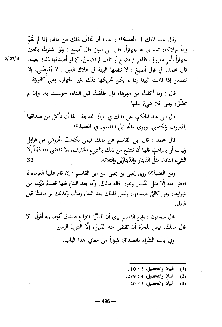 وقال عبد الملك فى العتبية: عليها أن تخلف ذلك من مالها، إذا لم تقم بينة بهلاكه، تشترى به جهازاً. قال ابن المواز قال أصبغ: ولو اشترت بالعين جهازاً بامر معروف ظاهر فضاع أو تلف لم تضمن، كما لو أصدقها ذلك بعينه. قال محمد، فى قول أصبغ: لا تنفعها البينة فى هلاك العين: لا يعجبنى، ولا تضمن إذا قامت البينة إذا لم يكن تحريكها ذلك لغير الجهاز، وهى كالورثة. قال: وما أكلت من مهرها، فإن طلقت قبل البناء، حوسبت به، وإن لم تطلق، وبنى فلا شىء عليها.