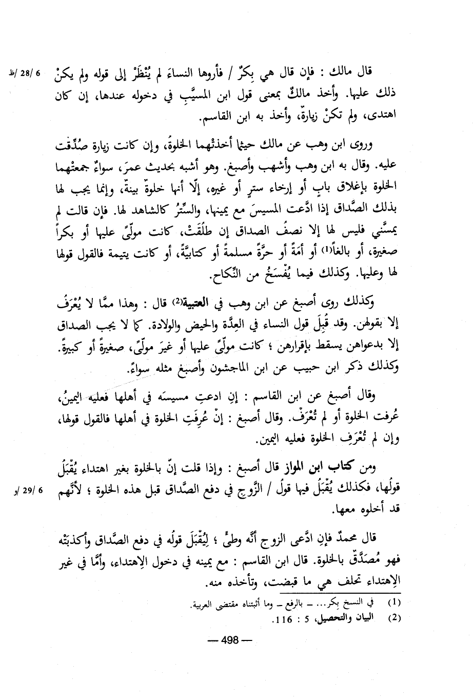 قال مالك: فإن قال هى بكر فاروها النساء لم ينظر إلى قوله ولم يكن ذلك عليها. وأخذ مالك بمعنى قول ابن المسيب فى دخوله عندها، إن كان اهتدى، ولم تكن زيادة، واخذ به ابن القاسم.