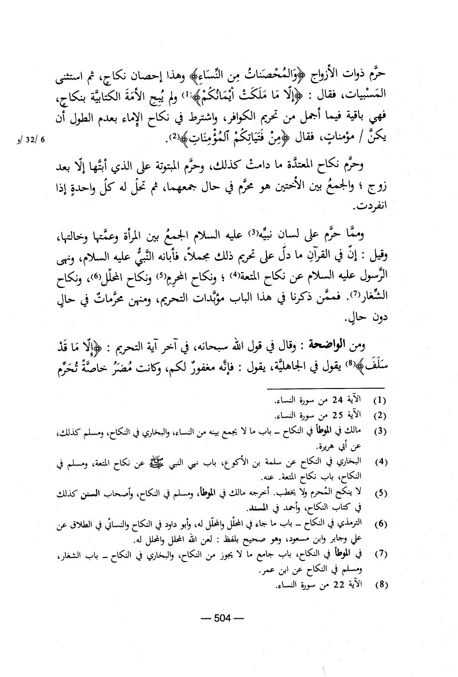 حرم ذات الأزواج (والمحصنات من النساء) وهذا إحصان نكاح، ثم استثنى المسبيات، فقال: (إلا ما ملكت أيمانكم) ولم يبح الأمة الكتابية بنكاح، فهى باقية فيما أجمل من تحريم الكوافر، واشترط فى نكاح الإماء بعدم الطول أن يكن مؤمنات، فقال (من فتياتكم المؤمنات).