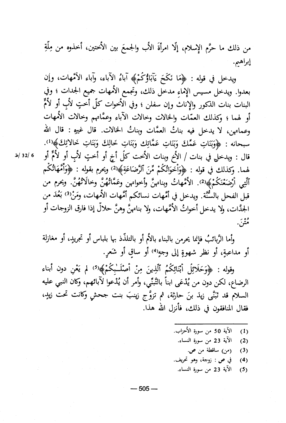 ويدخل فى قوله) ما نكح ءآباؤكم) آباء الآباء، وآباء الأمهات، وإن بعدوا. ويدخل مسيس الإماء مدخل ذلك، وتجمع المهات جميع الجدات؛ وفى البنات بنات الذكور والإناث وإن سفلن؛ وفى الأجوات كل أخت لأب أو لأم أو لهما؛ وكذلك العمات والخالات وخالات الأباء وعماتهم وخالات الأمهات وعماتهن، لا يدخل فيه بنات العمات وبنات الخالات. قال غيره: قال الله سبحانه: (وبنات عمك وبنات عماتك وبنات خالك وبنات خالاتك).قال: ويدخل في بنات الأخ وبنات الأخت كل أخ أوأخت لأب أولأم أو لهما. وكذلك في قوله: (وأخواتكم من الرضاعة) ويحرم بقوله: (وأمهاتكم التي أرضعنكم).الأمهات وبناتهن وأخواتهن وعماتهن وخالاتهن. ويحرم من قبل الفحل بالسنة. ويدخل فى أمهات نسائكم أمهات الأمهات، ومن بع من الجدات، ولا يدخل أخوات الأمهات، ولا بناتهن وهم حلال إذا فارق الزوجات أو متن.
