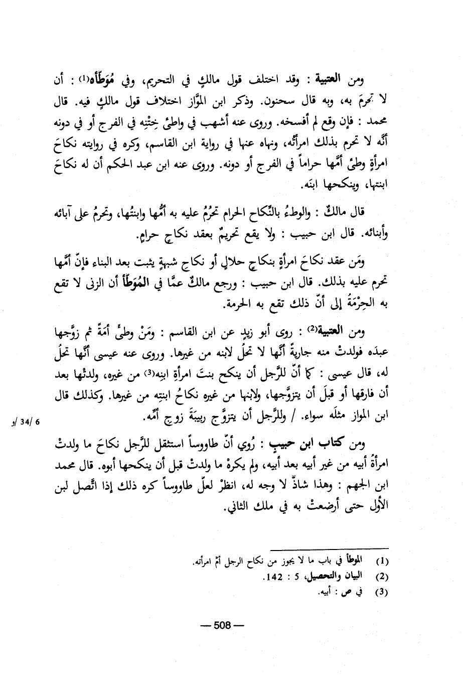 ومن عقد نكاح امرأة بنكاح حلال أو نكاح شبهة يثبت بعد البناء فإن أمها تحرم عليه بذلك. قال ابن حبيب: ورجع مالك عما فى الموطأ أن الزنى لا تقع به الحرمة إلى أن ذلك تقع به الحرمة.