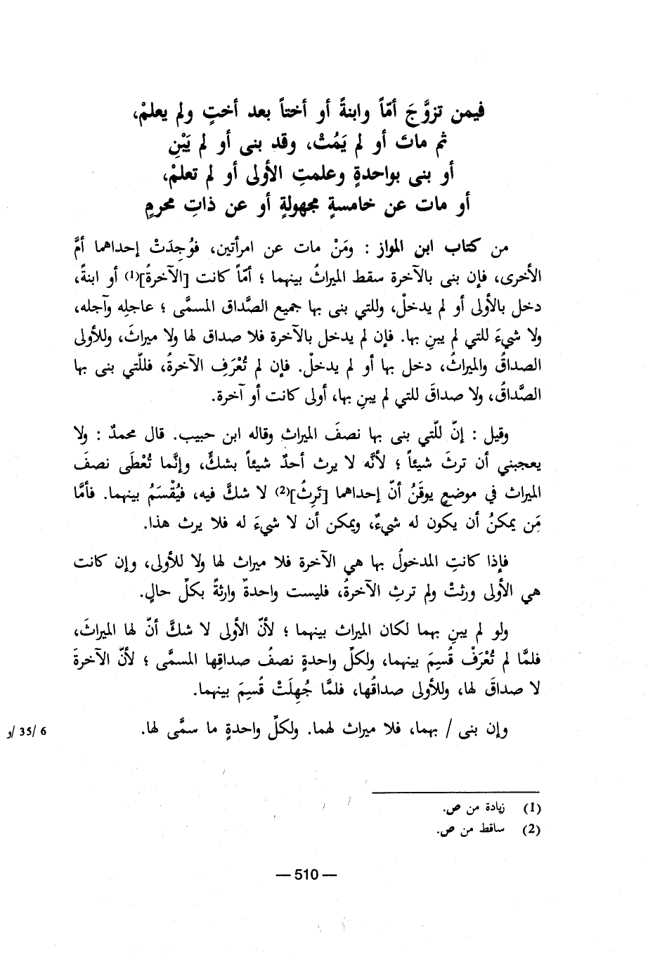 من كتاب ابن المواز: ومن مات عن امرأتين، فوجدت إحداهما أم الأخرى، فإن بنى بالآخرة سقط الميراث بينهما؛ أما كانت الآخرة أو ابنة، دخل بالولى أو لم يدخل، وللتى بنى بها جميع الصداق المسمى؛ عاجله وآجله، ولا شىء للتى لم يبن بها. فإن لم يدخل بالآخرة فلا صداق لها ولا ميراث، وللأولى الصداق والميراث، دخل بها أو لم يدخل. فإن لم تعرف الآخرة، فللتى بنى بها الصداق، ولا صداق للتىلم يبن بها، اولى كانت أو آخرة.