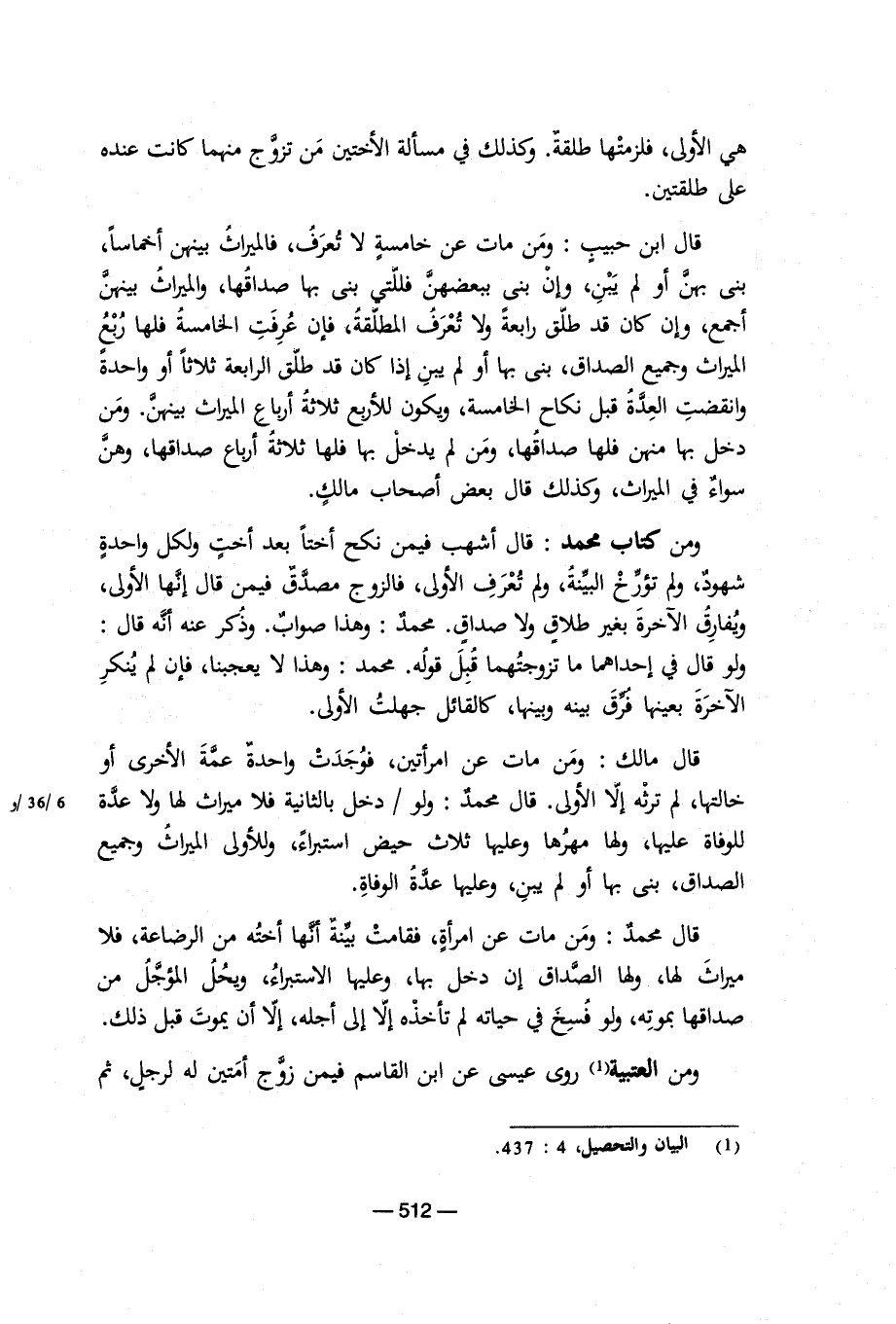 قال ابن حبيب: ومن مات عن خامسة لا تعرف، فالميراث بينهما أخماساً، بنى بهن أو لم يبن، وإن بنى ببعضهن فاللتى بنى بها صداقها، والميراث بينهما أجمع، وإن كان قد طلق رابعة ولا تعرف المطلقة، فإن عرفت الخامسة فلها ربعالميراث وجميع الصداق، بنى بها أو لم يبن إذا كان قد طلق الرابعة ثلاثاً او واحدة وانقضت العدة قبل نكاح الخامسة، ويكون للاربع ثلاثة أرباع الميراث بينهن. ومن دخل بها منهن فلها صداقها، ومن لم يدخل بها فلها ثلاثة أرباع صداقها، وهنسواء فى الميراث، وكذلك قال بعض اصحاب مالك.