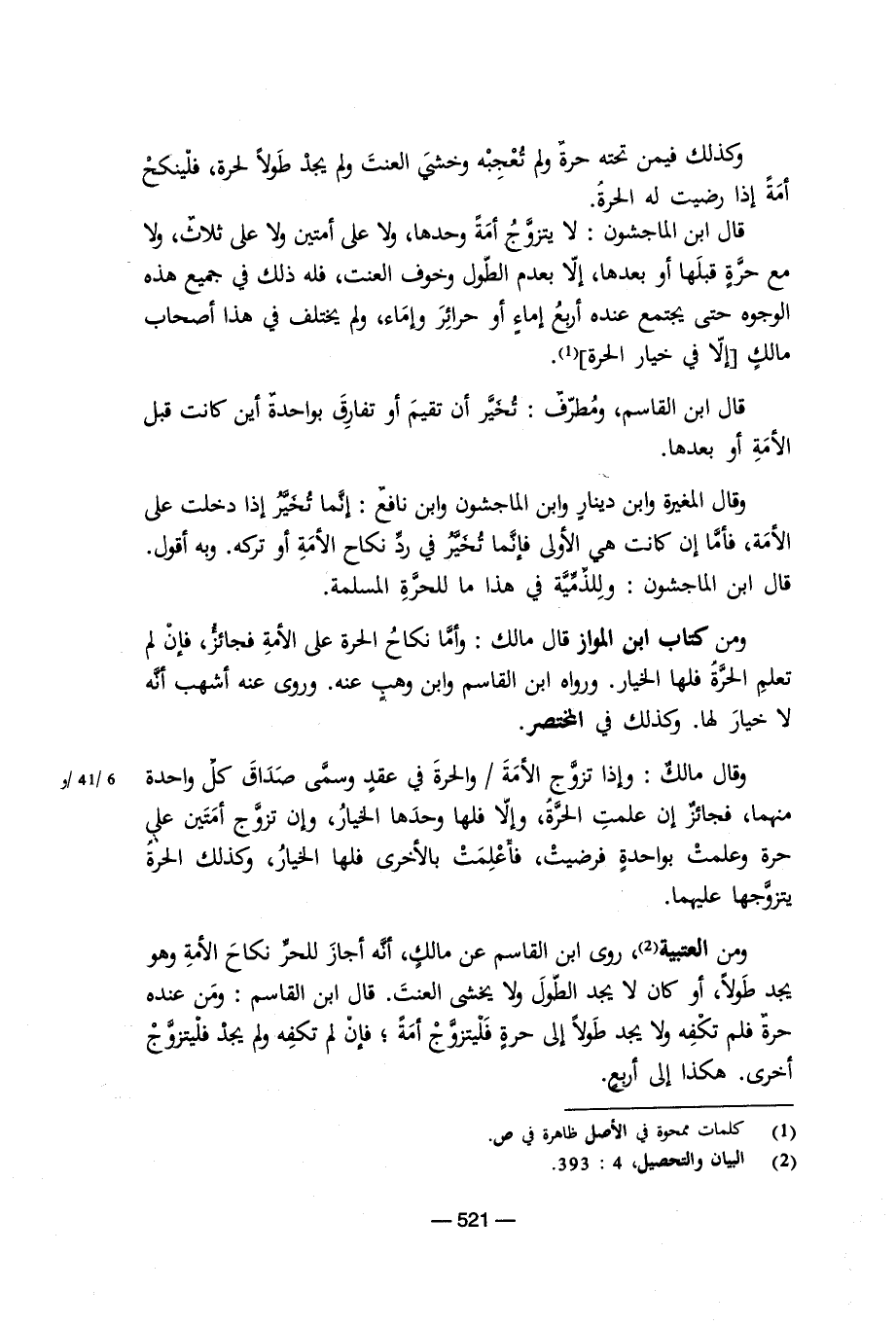 ومن العتبية، روى ابن القاسم عن مالك، أنه أجاز للحر نكاح الأمة وهو يجد طولاً إلى حرة فليتزوج أمة؛ فإن لم تكفه ولم يجد فليتوزج أخرى. هكذا إلى اربع.
