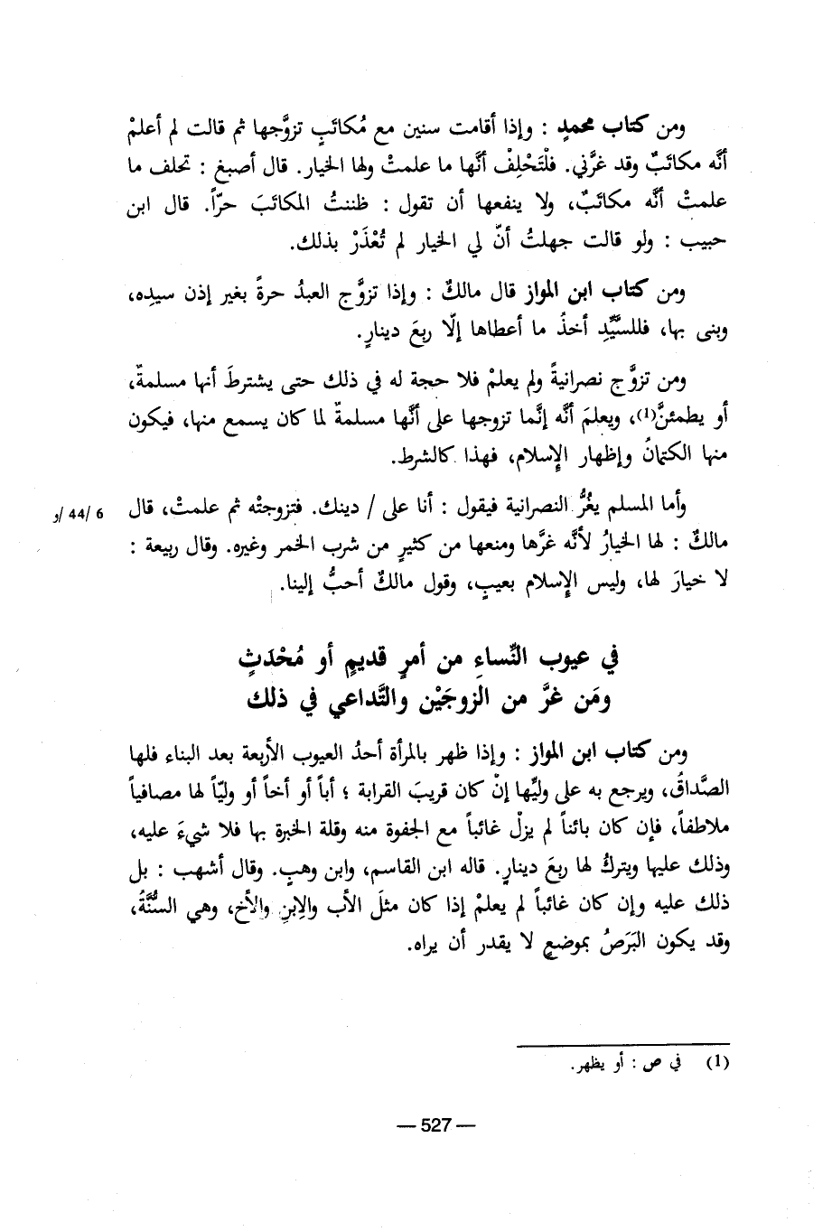 وأما المسلم يغر النصرانية فيقول: أنا على دينك. فتزوجه ثم علمت، قال مالك: لها الخيار لأنه غرها ومنعها من كثير من شرب الخمر وغيره. وقال ربيعة: لا خيار لها، وليس الإسلام بعيب، وقول مالك أحب إلينا.