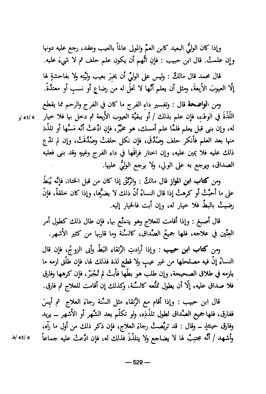 قال أصبغ: وإذا أقامت للعلاج وهو يتمتع بها، فإن طال ذلك كطول أمر العنين فى علاجه، فلها جميع الصداق، كالسنة وما قاربها من كثير الأشهر. ومن كتاب ابن حبيب: وإذا أرادت الرتقاء البط وأبى الزوج، فغن قال النساء إن فيه مصلحتها من غير عيب ولا قطع لذة فذلك لخا، فإن طلق لزمه ما يلزمه فى طلاق الصحيحة، فغن طلب هو بطها فأبت لم تجبر، فإن كرهها وفارق فلا صداق عليه، إلا أن يطول تمتعه كالسنة، وكذلك إن أقامت للعلاج ثم فارق. قال ابن حبيب: وإذا أقام مع الرتقاء مثل السنة رجاء العلاج ثم أيس ففارق، فلها جميع الصداق لطول تلذذه، ولو تكلم بعد الشهر أو الأشهر يريد وفارق حينئذ وقال: قد تربصت رجاء العلاج، فإن ذكر ذلك من أول ما رآه، وأشهد أنه مجتنب لها لا يضاجع ولا يتلذذ فذلك له، فإن ادعت عليه جماعاً
