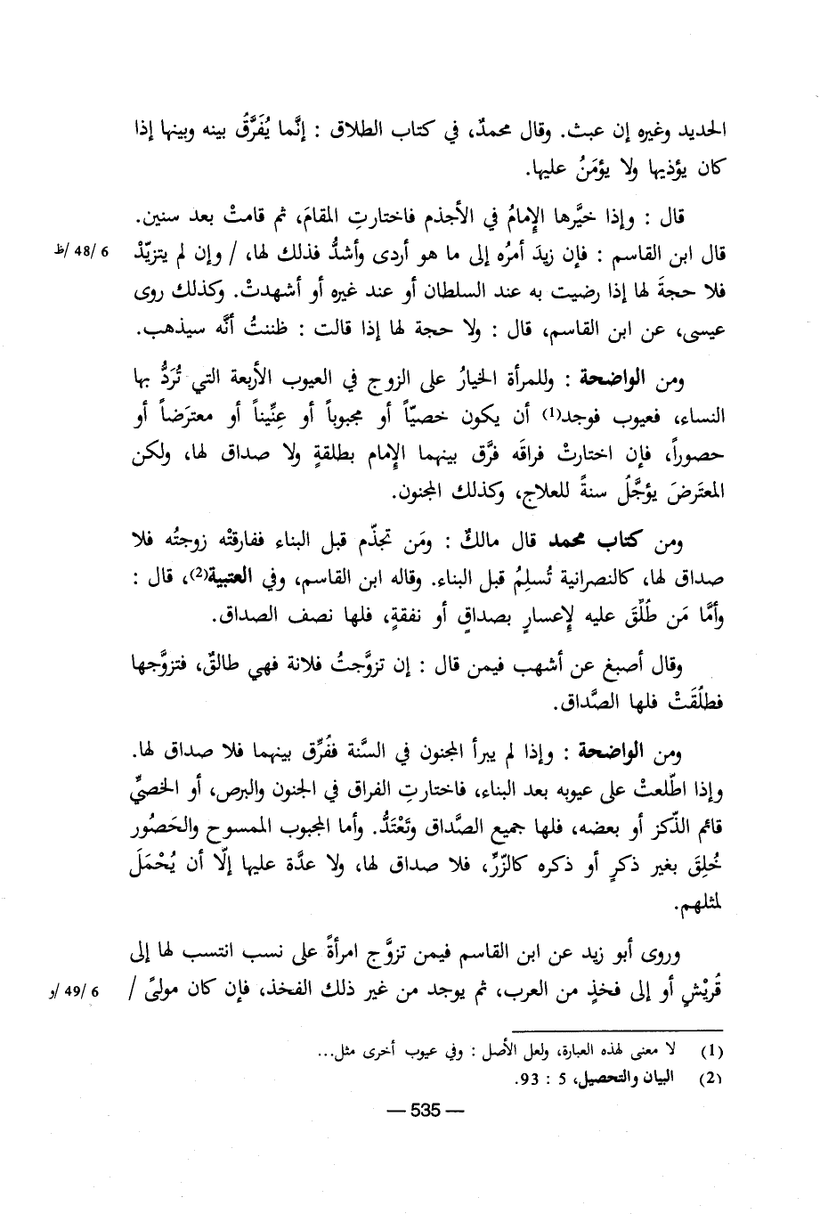 ومن الواضحة: وإذا لم يبرأ المجنون فى السنة ففرق بينهما فلا صداق لها. وإذا اطلعت على عيوبه بعد البناء، فاختارت الفراق فى الجنون والبرص، أو الالخصى قائم الذكر أو بعضه، فلها جميع الصداق وتعتد. وأما المجبوب المسموح والحصور خلق بغير ذكر أو ذكره كالزر، فلا صداق لها، ولا عدة عليها إلا أن يحمل لمثلهم.