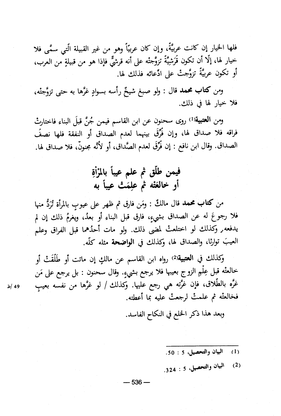 وكذلك فى العتبية رواه ابن القاسم عن مالك إن ماتت أو طلقت أو خالعته قبل علم الزوج بعيبها فلا يرجع يشىء. وقال سحنون: بل يرجع على من غره بالطلاق، فإن غرته هى رجع عليها. وكذلك لو غرها من نفسه بعيب فخالعته ثم علمت لرجعت عليه بما أعطته.