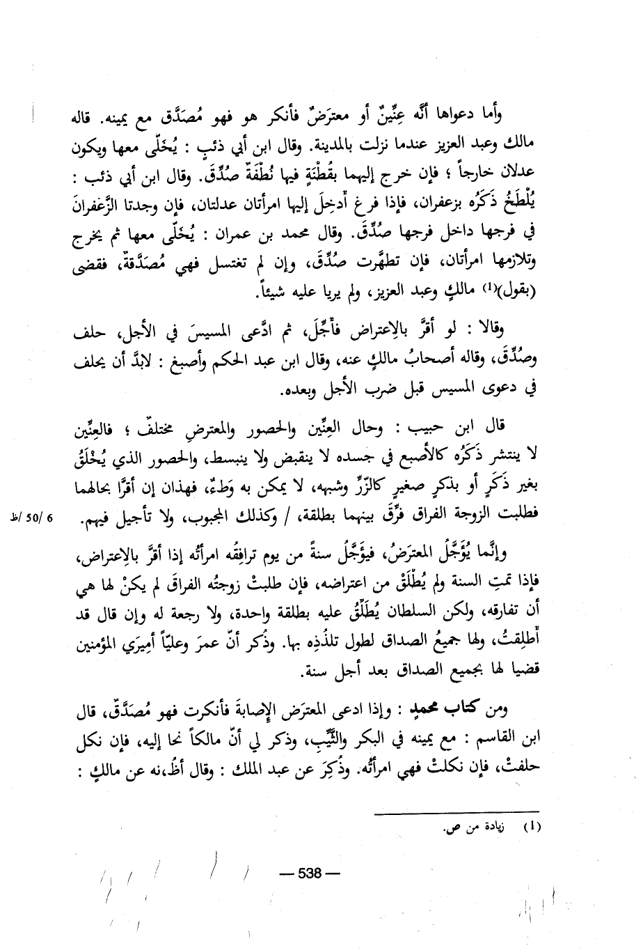 قال ابن حبيب: وحال العنين والحصور والمعترض مختلف؛ فالعنين لا ينتشر ذكره كالأصبع فى جسده لا ينقبض ولا ينبسط، والحصور الذى يخلق بغير ذكر أو بذكر صغير كالزر وشبهه، لا يمكن به وطء، فهذان إن أقر بحالهما فطلبت الزوجة الفراق فرق بينهما بطلقة، وكذلك المجبوب، ولا تأجيل فيهم. وإنما يؤجل المعترض، فيؤجل سنة من يوم يرافقه امرأته إذا اقر بالاعتراض، فإذا تمت السنة ولم يطلق من اعتراضه، فإن طلبت زوجته الفراق لم يكن لها هى أن تفارقه، ولكن السلطان يطلق عليه بطلقة واحدة، ولا رجعة له وإن قال قد أطلقت، ولها جميع الصداق لطول تلذذه بها. وذكر أن عمر وعلياً أميرى المؤمنين قضيا لها بجميع الصداق بعد أجل سنة.
