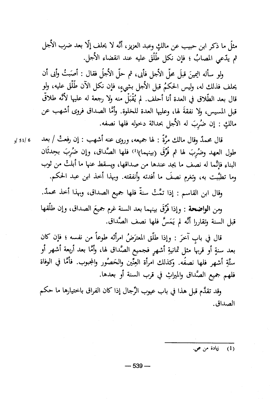 قال فى باب آخر: وإذا طلق المعترض امرأته طوعاً من نفسه؛ فإن كان بعد سنة أو قربها مثل ثمانية أشهر فجميع الصداق لها، وأما بعد أربعة أشهر أو ستة أشهر فلها نصفه. وكذلك امرأة العنين ووالحصور والمجبوب. فأما فى الوفاه فلهم جميع الصداق والميراث فى قرب السنة أو بعدها.