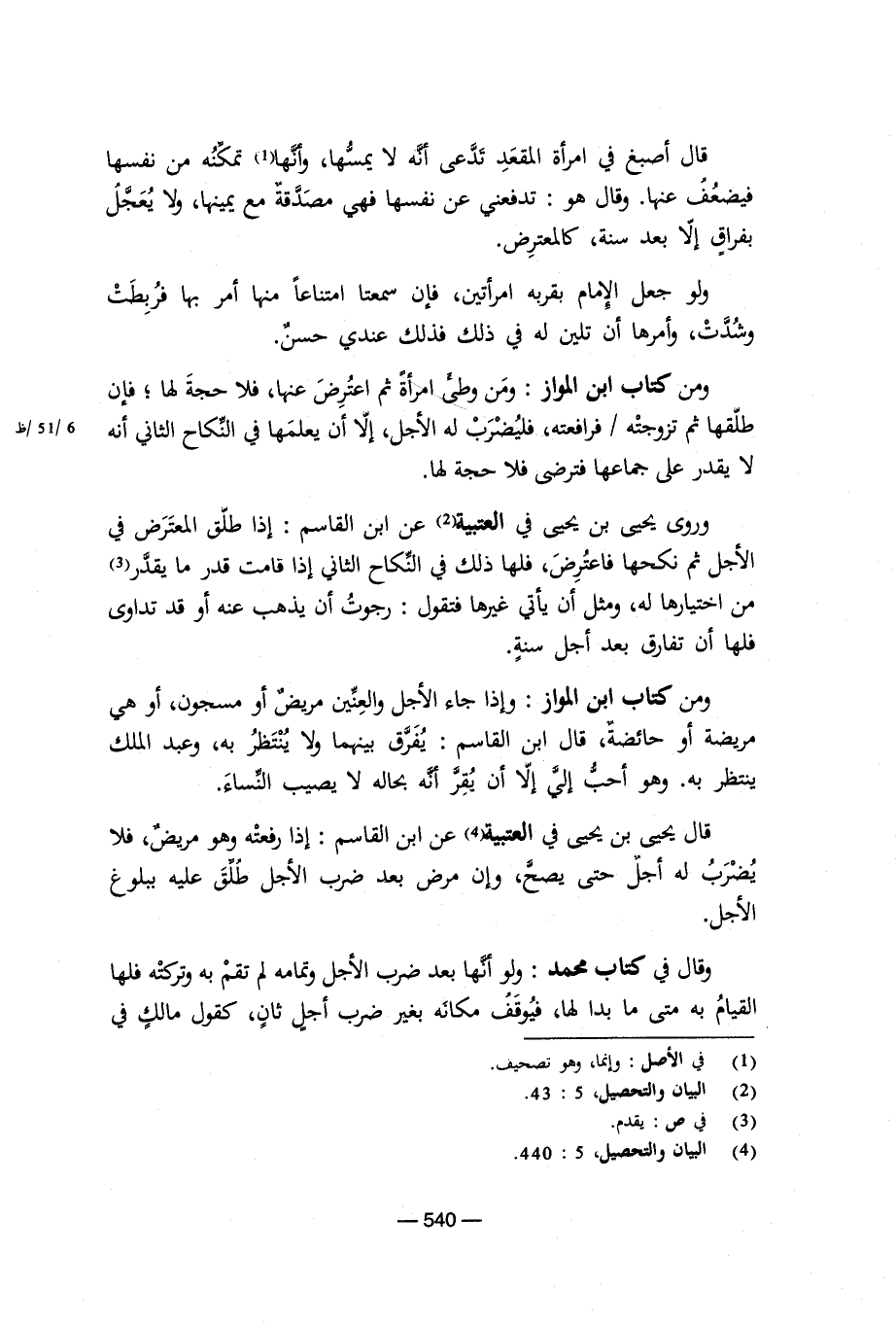 ومن كتاب ابن المواز: وإذا جاء الأجل والعنين مريض أو مسجون، أو هى مريضة أو حائضة، قال ابن القاسم: يفرق بينهما ولا ينتظر به، وعبد الملك ينتظر به. وهو أحب إلى إلا أن يقر أنه بحاله لا يصيب النساء.