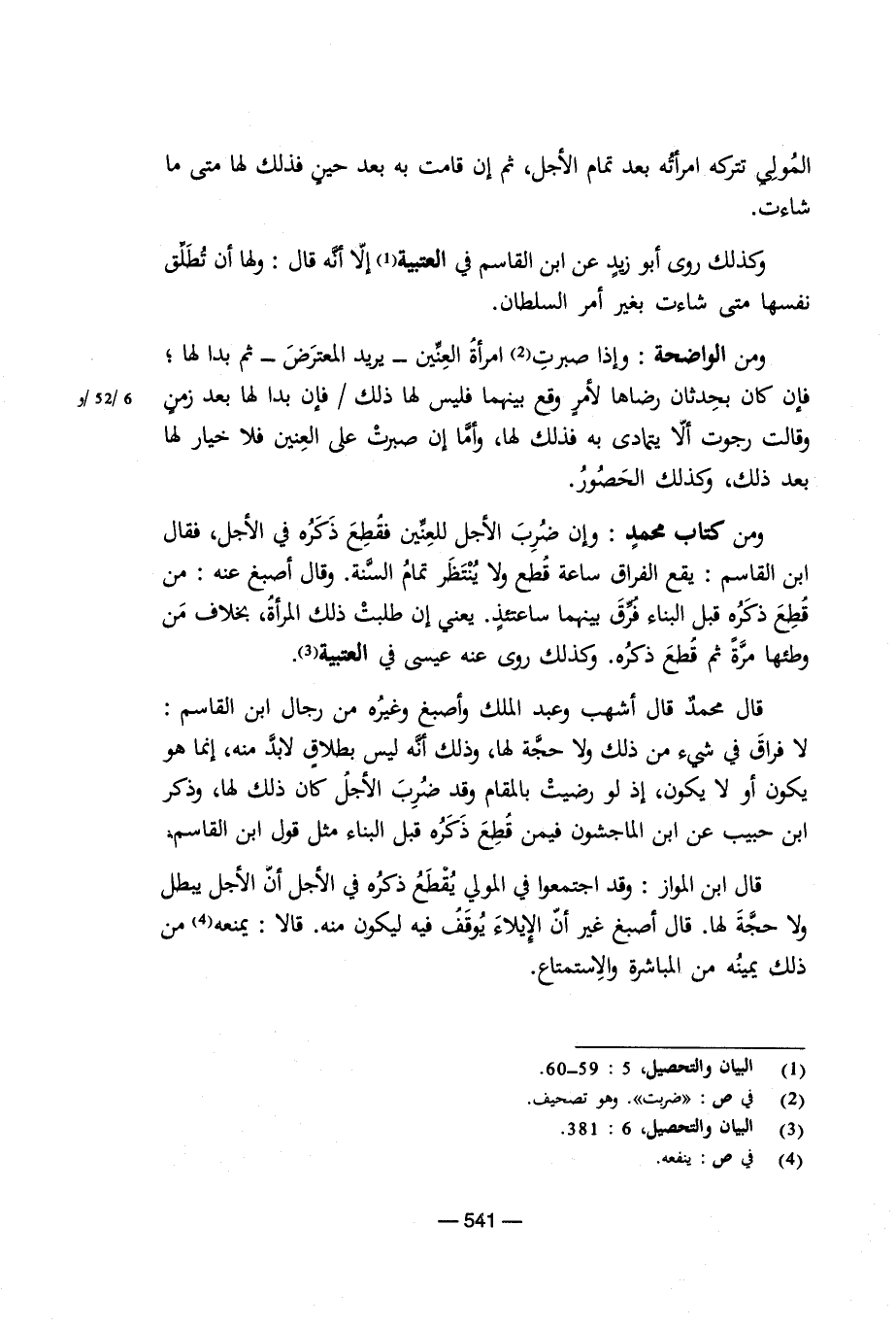 وكذلك روى ابو زيد عن ابن القاسم فى العتبية إلا أنه قال: ولها أن تطلق نفسها متى شاءت بغير لأمر السلطان.