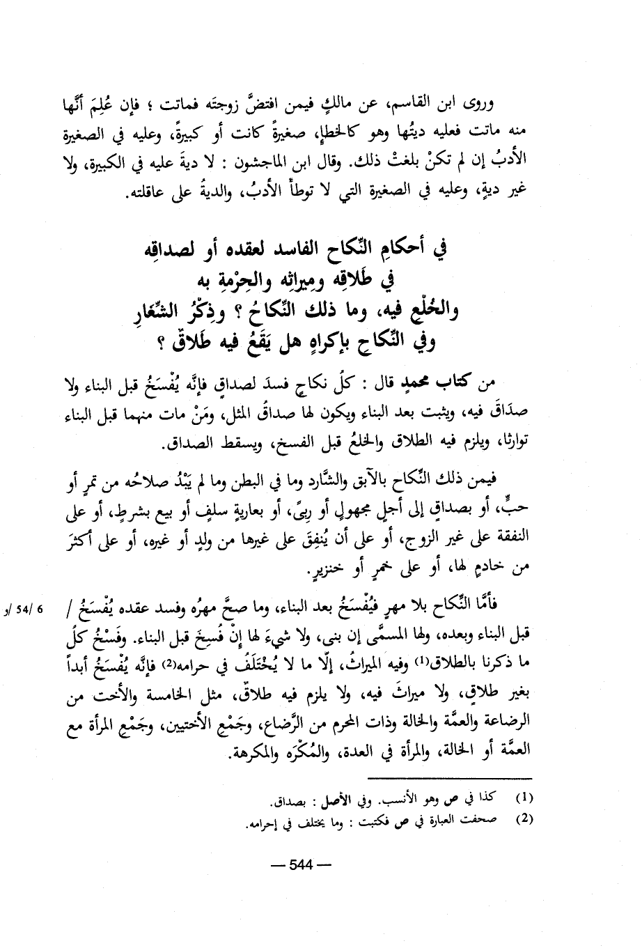 فيمن ذلك النكاح بالآبق والشارد وما فى البطن وما لم يبد صلاحه من تمر أو حب، أو بصداق إلى أجل مجهول أو رأيى، أو بعارية سلف أو بيع بشرط، أو على النفقة على غير الزوج، أو على أن ينفق على غيرها من ولد أو غيره، أو على أكثر من خادم لها، أو على خمر أو خنزير.