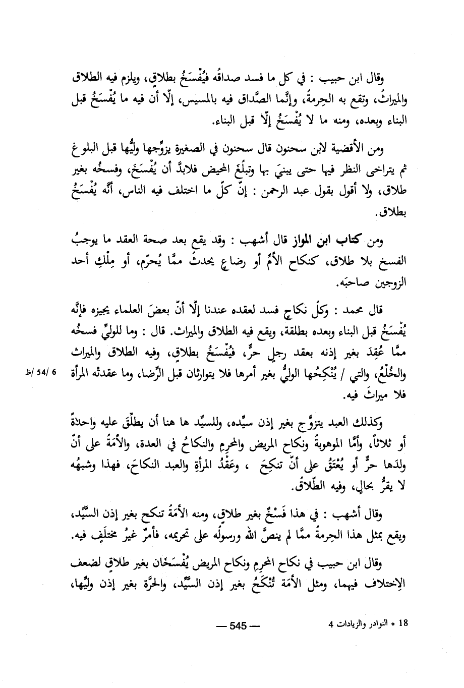 وقال أشهب: فى هذا فسخ بغير طلاق، ومنه الأمة تنكح بغير إذن السيد، ويقع بمثل هذا الحرمة مما لم ينص الله ورسوله على تحريمه، فأمر غير مختلف فيه. وقال ابن حبيب فى نكاح المحرم ونكاح المريض يفسخان بغير طلاق لضعف الاختلاف فيهما، ومثل الأمة تنكح بغير إذن السيد، والحرة بغير إذن وليها،