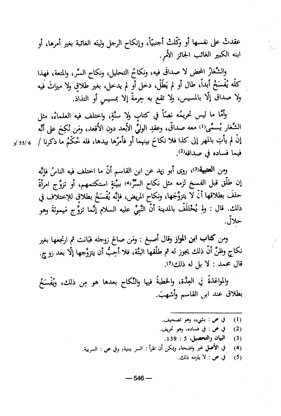 ومن العتبية روى أبو زيد عن ابن القاسم أن ما اختلف فيه الناس فإنه إن طلق قبل الفسخ لزمه مثل نكاح السر ببينة استكتمهم، أو تزوج امرأة حلف بطلاقها أن لا يتزوجها، ونكاح المريض، فإنه يفسخ بطلاق للاختلاف فى ذلك. قال: ولم يختلف بالمدينة أن النبى عليه السلام إنما تزوج ميمونة وهو حلال. ومن كتاب ابن المواز وقال أصبغ: ومن صالح زوجته فبانت ثم ارتجعها بغير نكاح وظن أن ذلك يجوز له ثم طلقها البتة، فلا أحب أن يتزوجها إلا بعد زوج. قال محمد: لا بل له ذلك. والمواعدة فى العدة، والخطبة فيها والنكاح بعدها هو من ذلك، ويفسخ بطلاق عند ابن القاسم وأشهب.