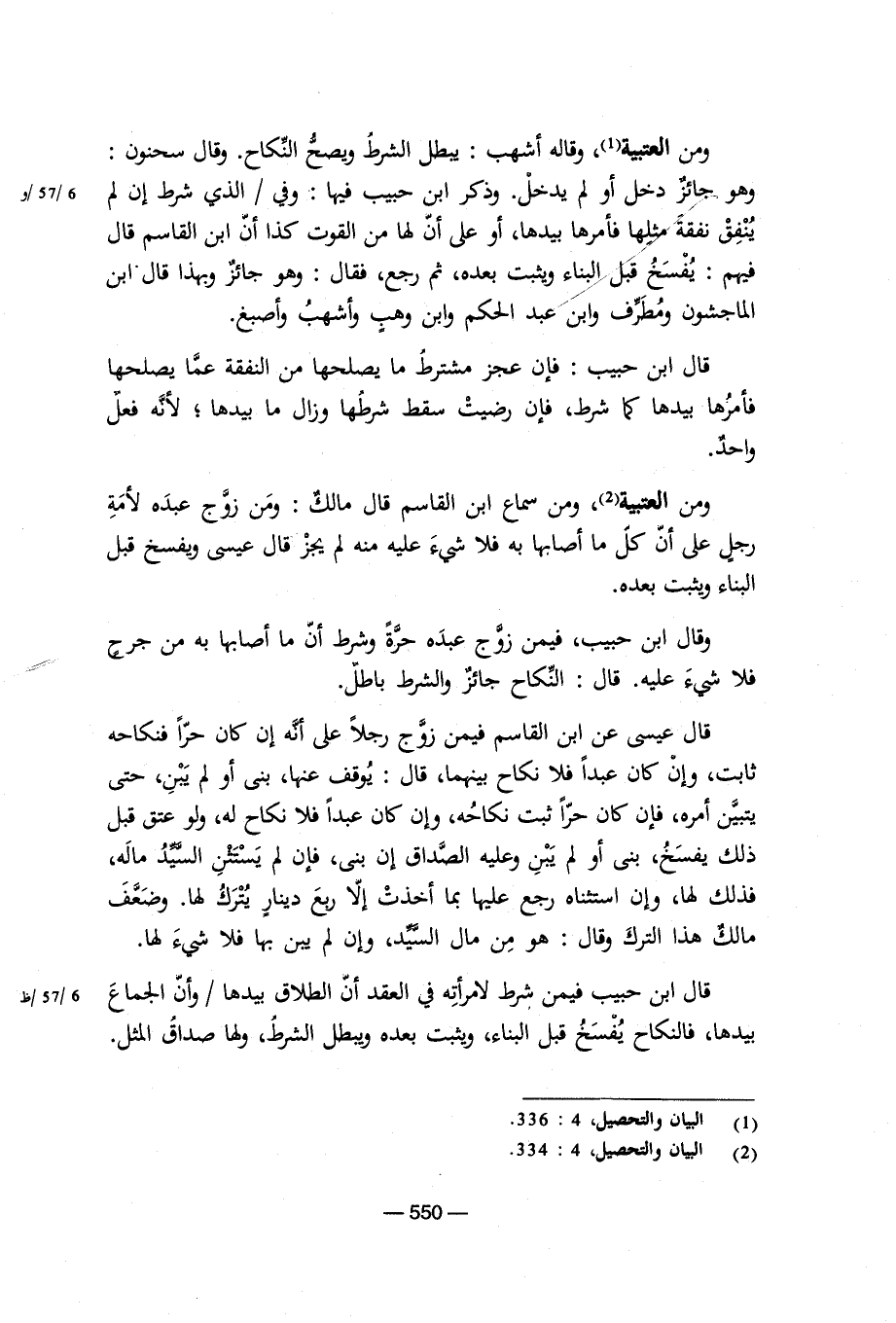 ومن العتبية، وقاله أشهب: يبطل الشرط ويصح النكاح. وقل سحنون: وهو جائز دخل أو لم يدخل. وذكر ابن حبيب فيها: وفى الذى شرطإن لم ينفق نفقة مثلها فأمرها بيدها، أو على أن لها من القوت كذا أن ابن القاسم قال فيهم: يفسخ قبل البناء ويثبت بعده، ثم رجع، فقال: وهو جائز وبهذا قال ابن الماجشون ومطرف وابن عبد الحكم وابن وهب وأشهب وأصبغ.