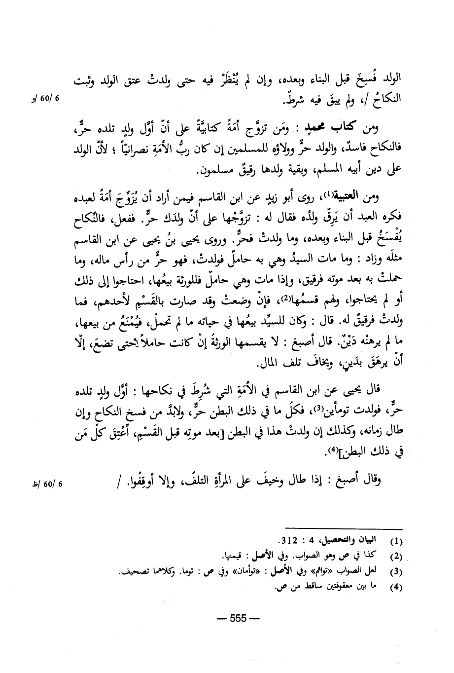 ومن العتبية روى أبو زيد عن ابن القاسم فيمن أراد أن يزوج أمة لعبده فكره العبد أن يرق ولده فقال له: تزوجها على أن ولدك حر. ففعل، فالنكاح يفسخ قبل البناء وبعده، وما ولدت فحر. وروى يحيى بن يحيى عن ابن القاسم مثله وزاد: وما مات السيد وهى به حامل فولدت، فهو حر من رأس ماله، وما حملت به بعد موته فرقيق، وإذا مات وهى حامل فللورثة بيعها، احتاجوا إلى ذلك أو لم يحتاجوا، ولهم قسمها، فإن وضعت وقد صارت بالقسم لأحدهم، فما ولدت فرقيق له. قال أصبغ: لا يقسمها الورثة إن كانت حاملاً حتى تضع، إلا أن يرهق بدين، ويخاف تلف المال.
